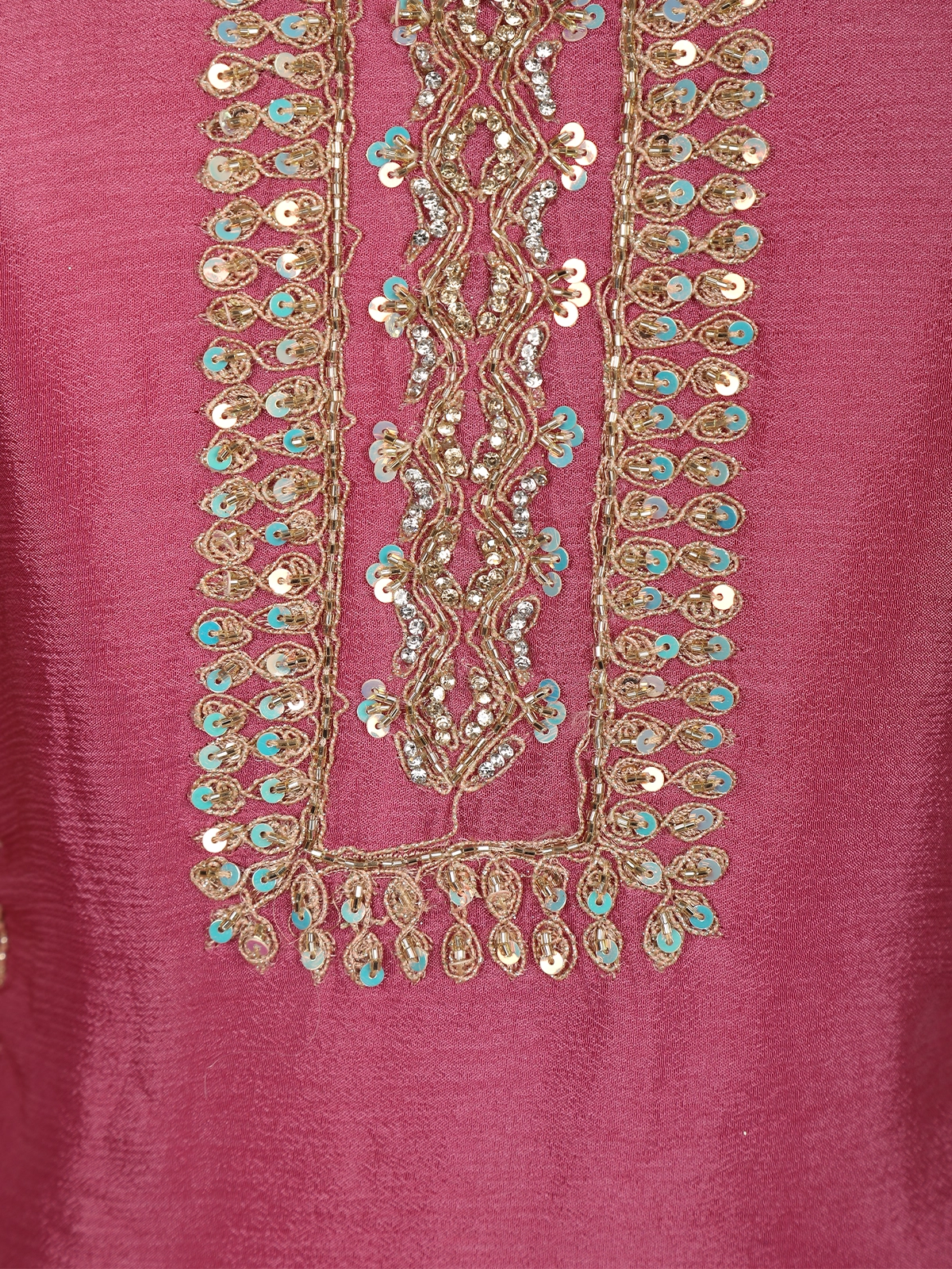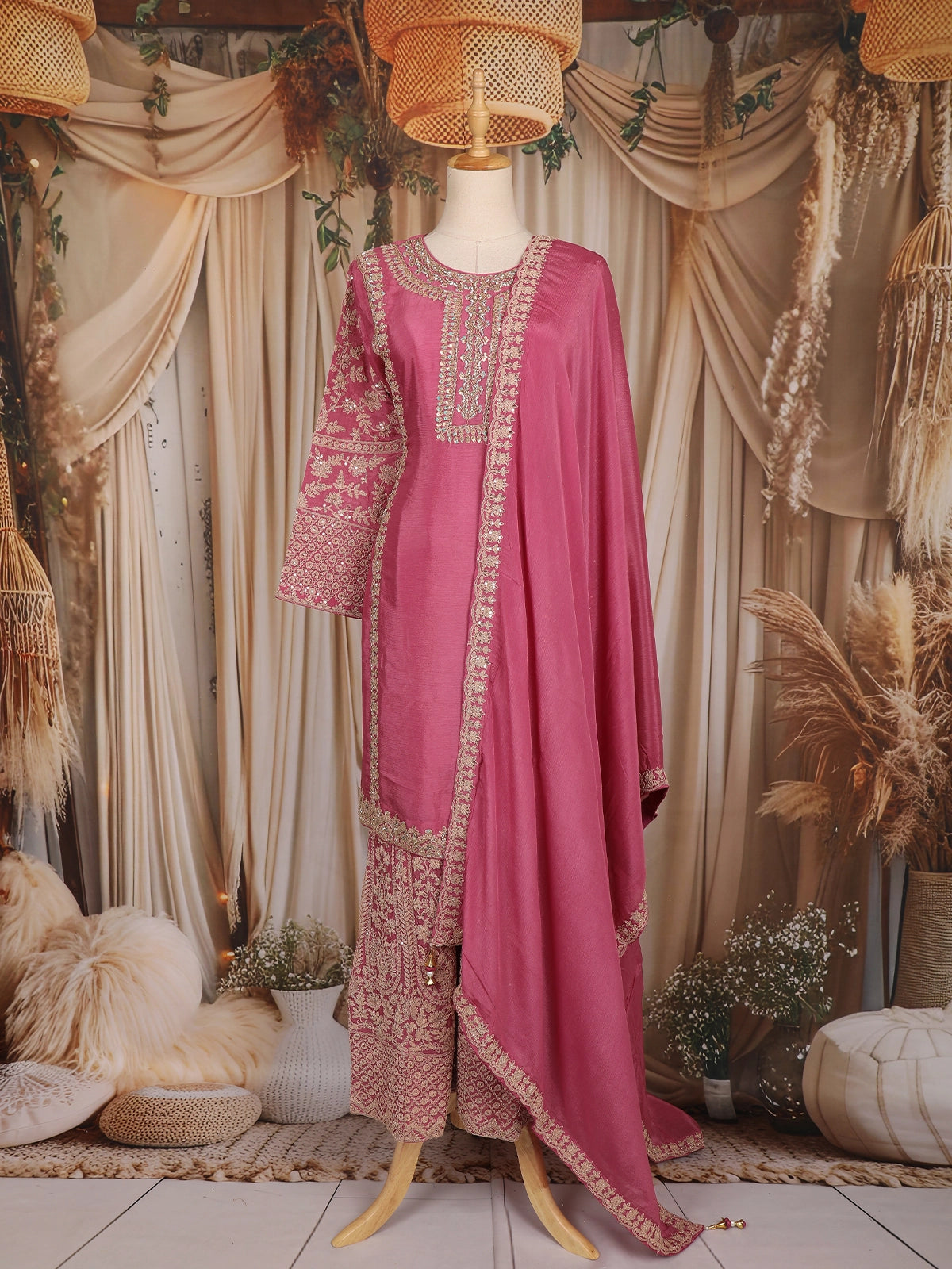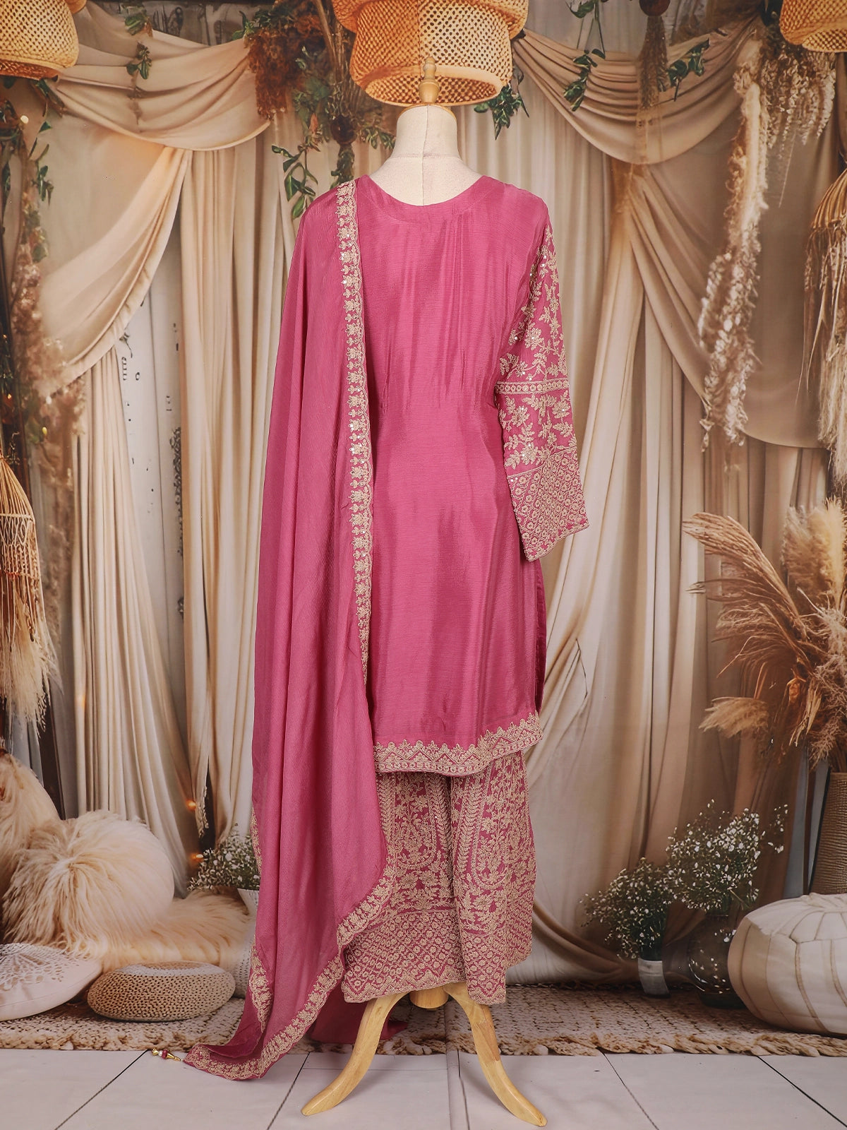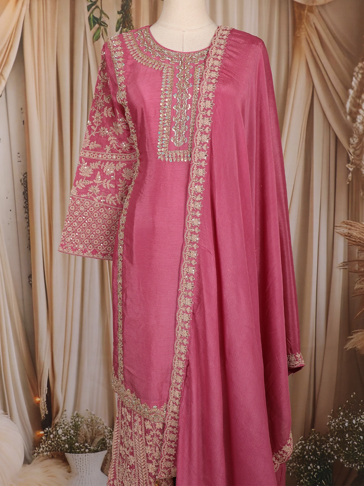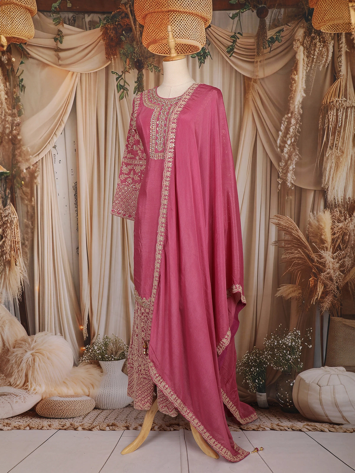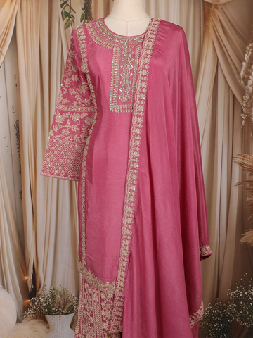 The ensemble is paired with a coordinating embroidered palazzo, featuring complementary motifs that enhance the richness of the outfit. Completing the look is a matching embroidered dupatta, highlighted with a decorated border that adds grace to every drape.