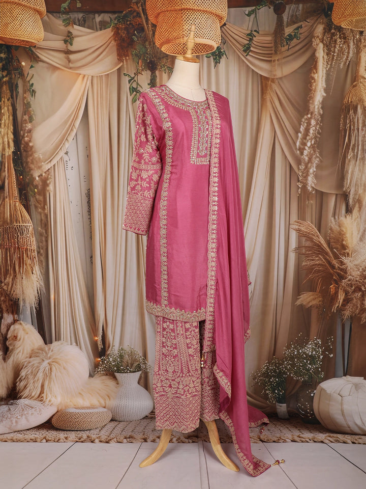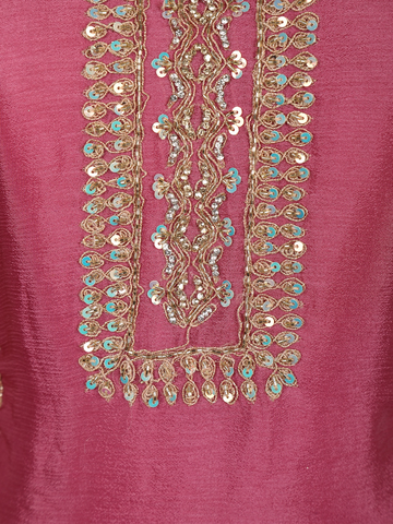 Make a graceful and striking statement with this Purple Floral Thread Embroidered Crepe Palazzo Suit, crafted to blend traditional craftsmanship with contemporary elegance. The deep, enchanting red shade radiates festive warmth and celebration, making it a perfect choice for special occasions.