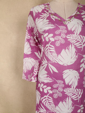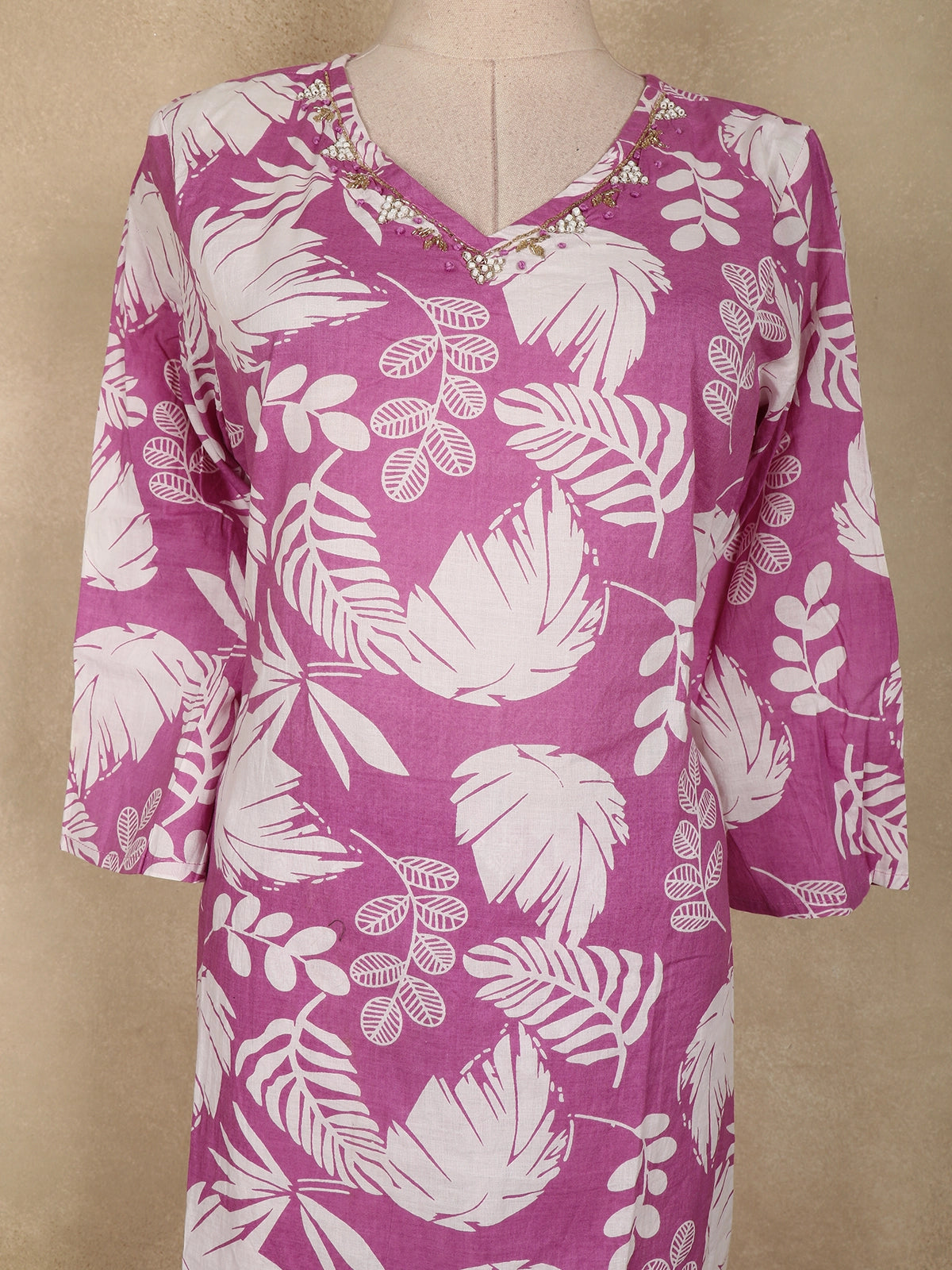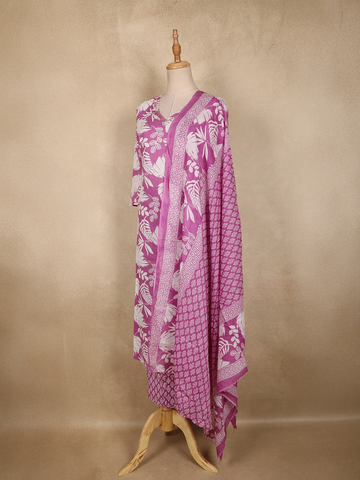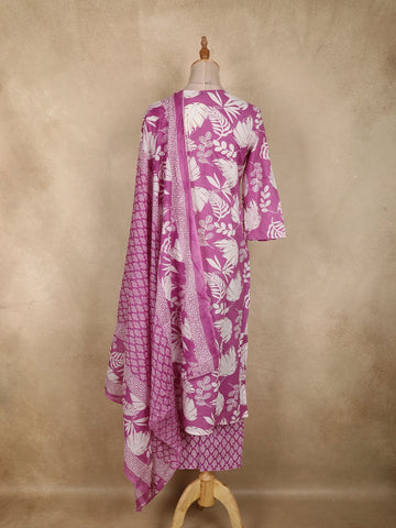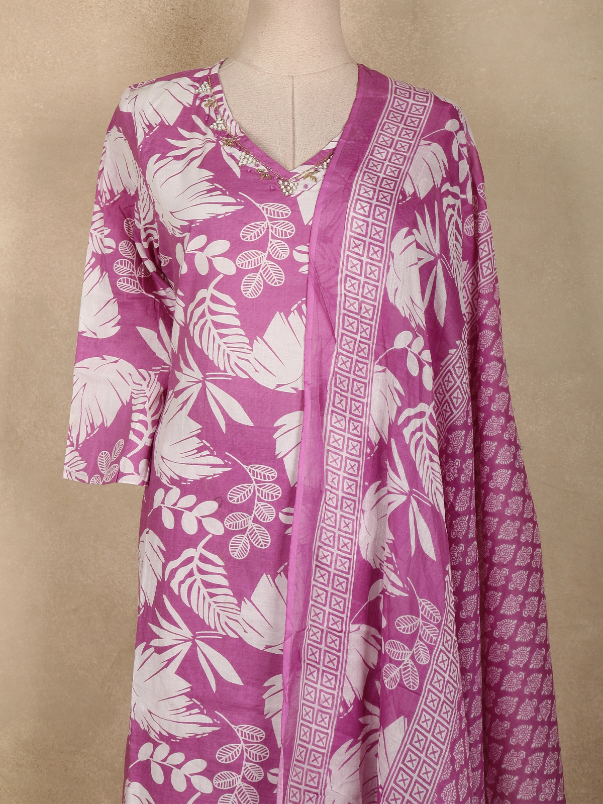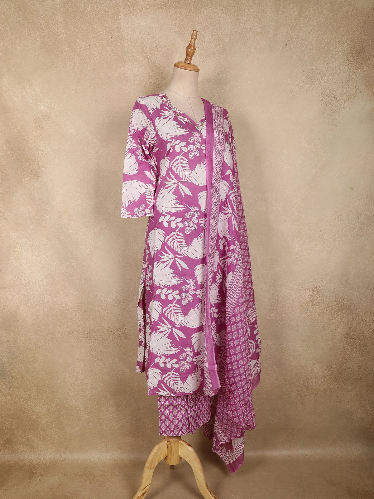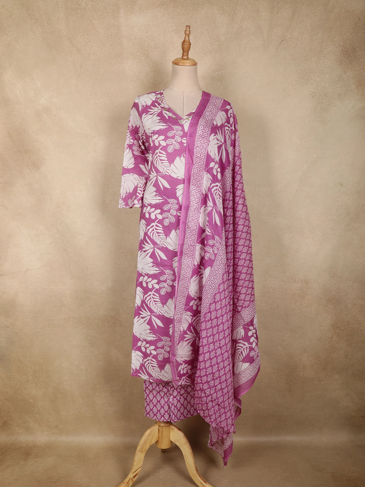 Purple Leaf Printed Design Cotton Straight Cut Salwar Suit with Dupatta