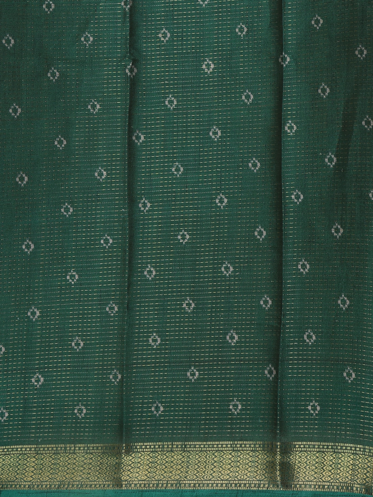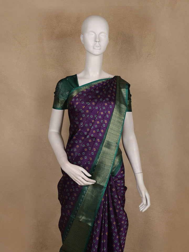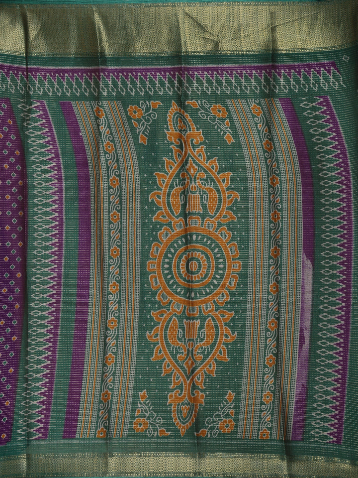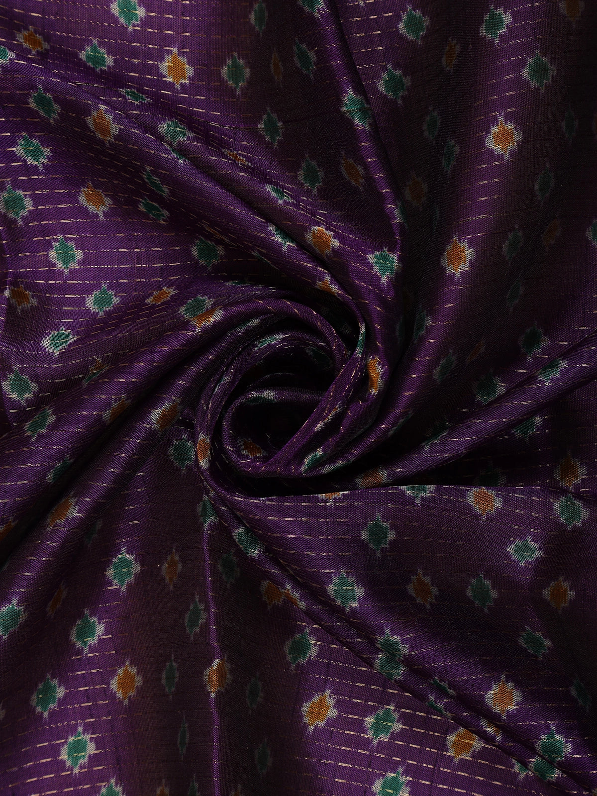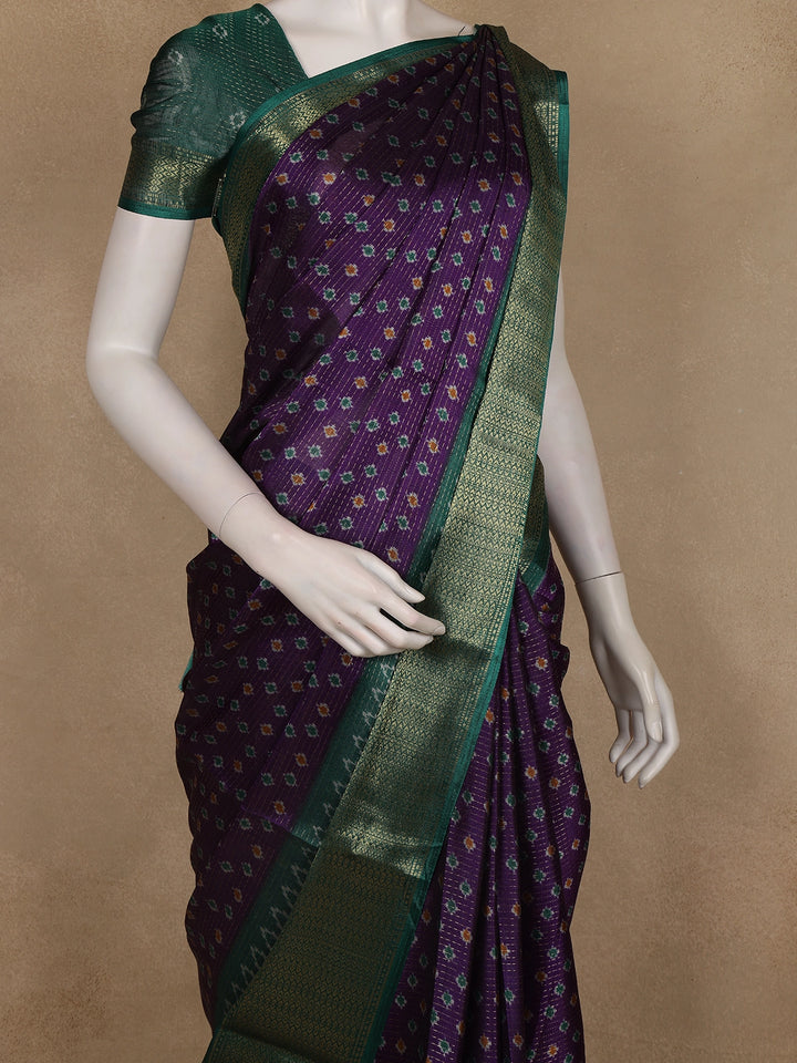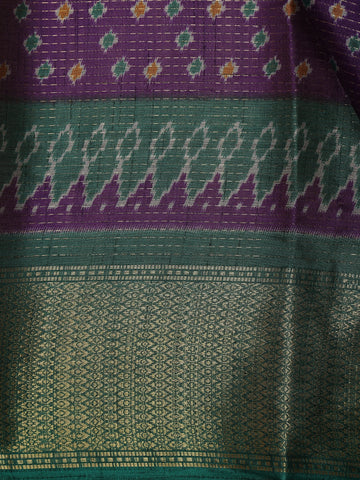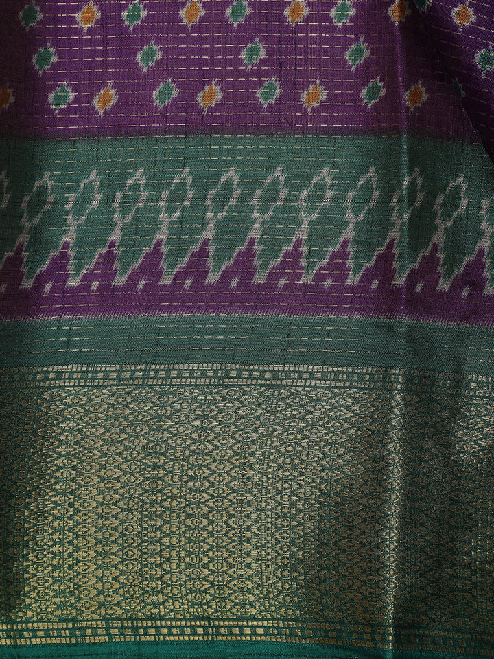 Celebrate heritage elegance with this Purple Pochampally Ikat Design Cotton Saree, a masterpiece inspired by timeless weaving artistry. The saree features intricate Pochampally Ikat motifs beautifully woven across a deep purple base, creating a luxurious texture and striking visual appeal. The contrast green zari border and pallu add a regal touch, highlighting the craftsmanship with a gleaming finish.