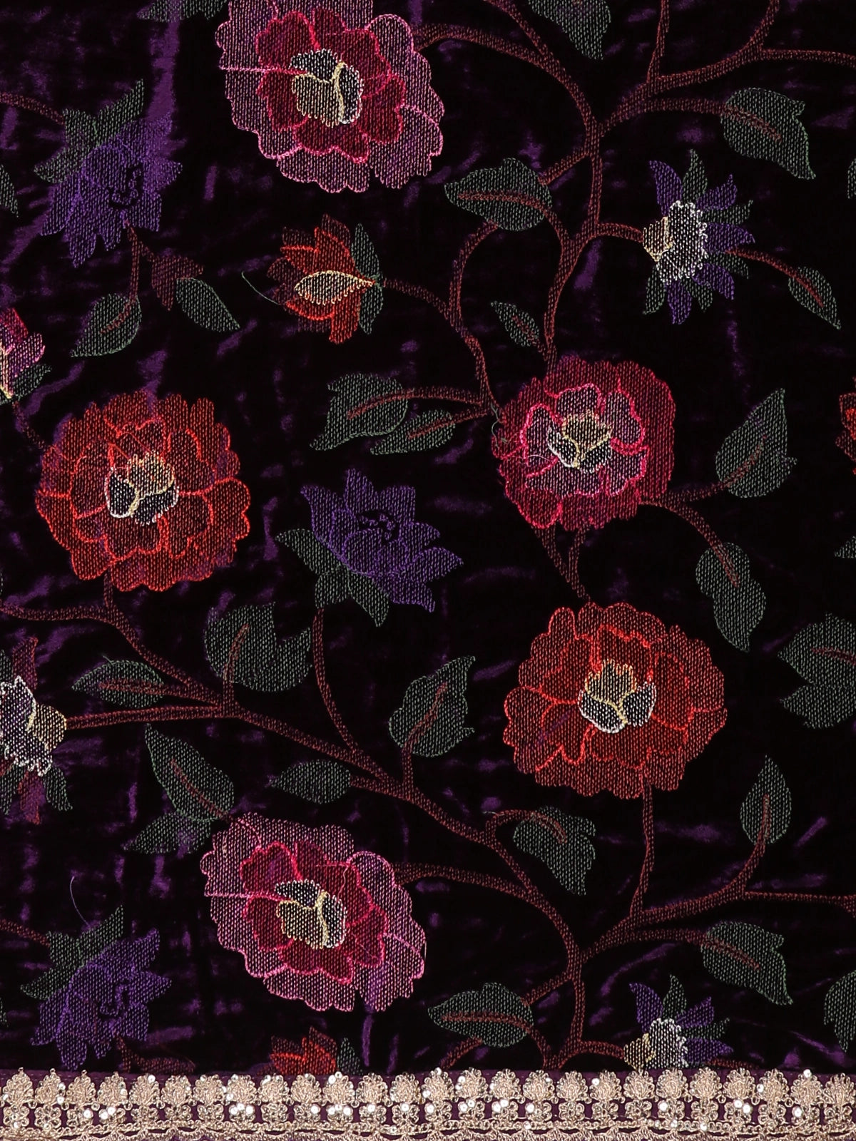 Completed with a matching purple pallu and blouse, this ensemble is ideal for cocktail parties, festive events, and elegant evening occasions.