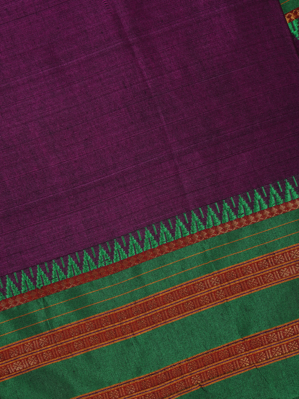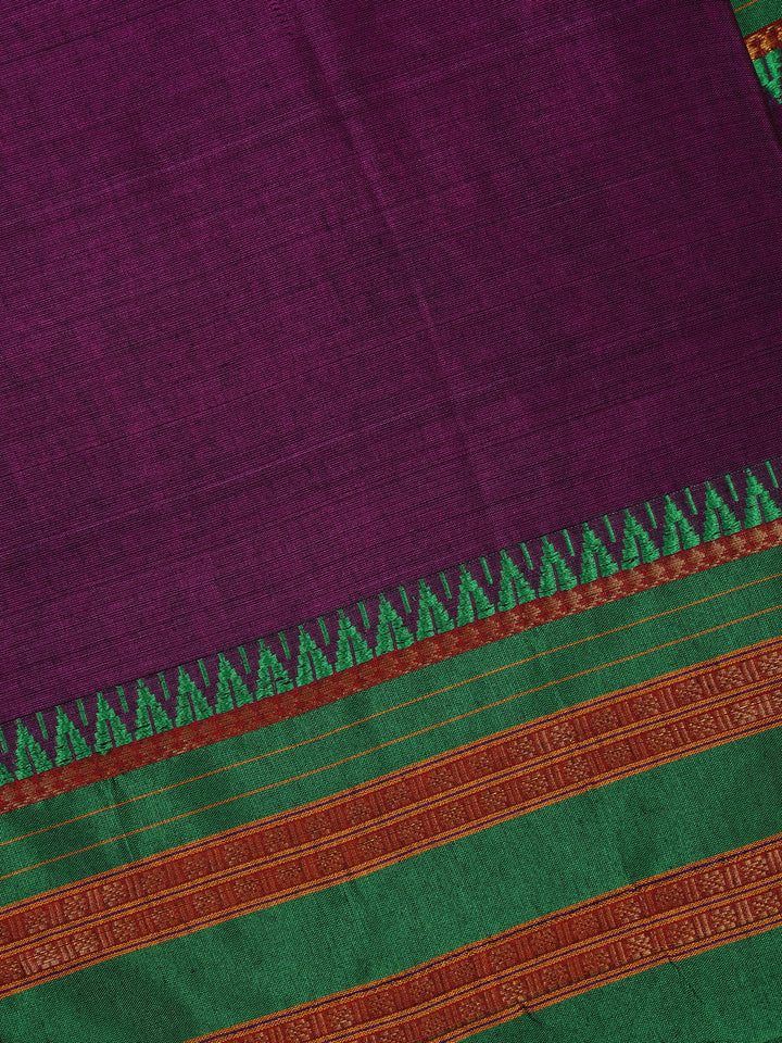 The contrast green border features intricate zari detailing and temple-inspired motifs, adding a rich cultural touch. The saree is finished with a purple pallu adorned with hand-twisted multicolor tassels, enhancing its elegant and handcrafted feel. Paired with the included contrast green blouse piece, the look is both classic and tasteful.