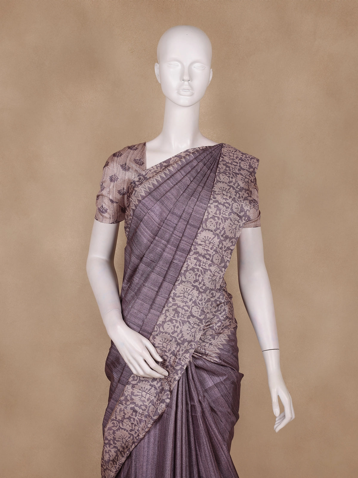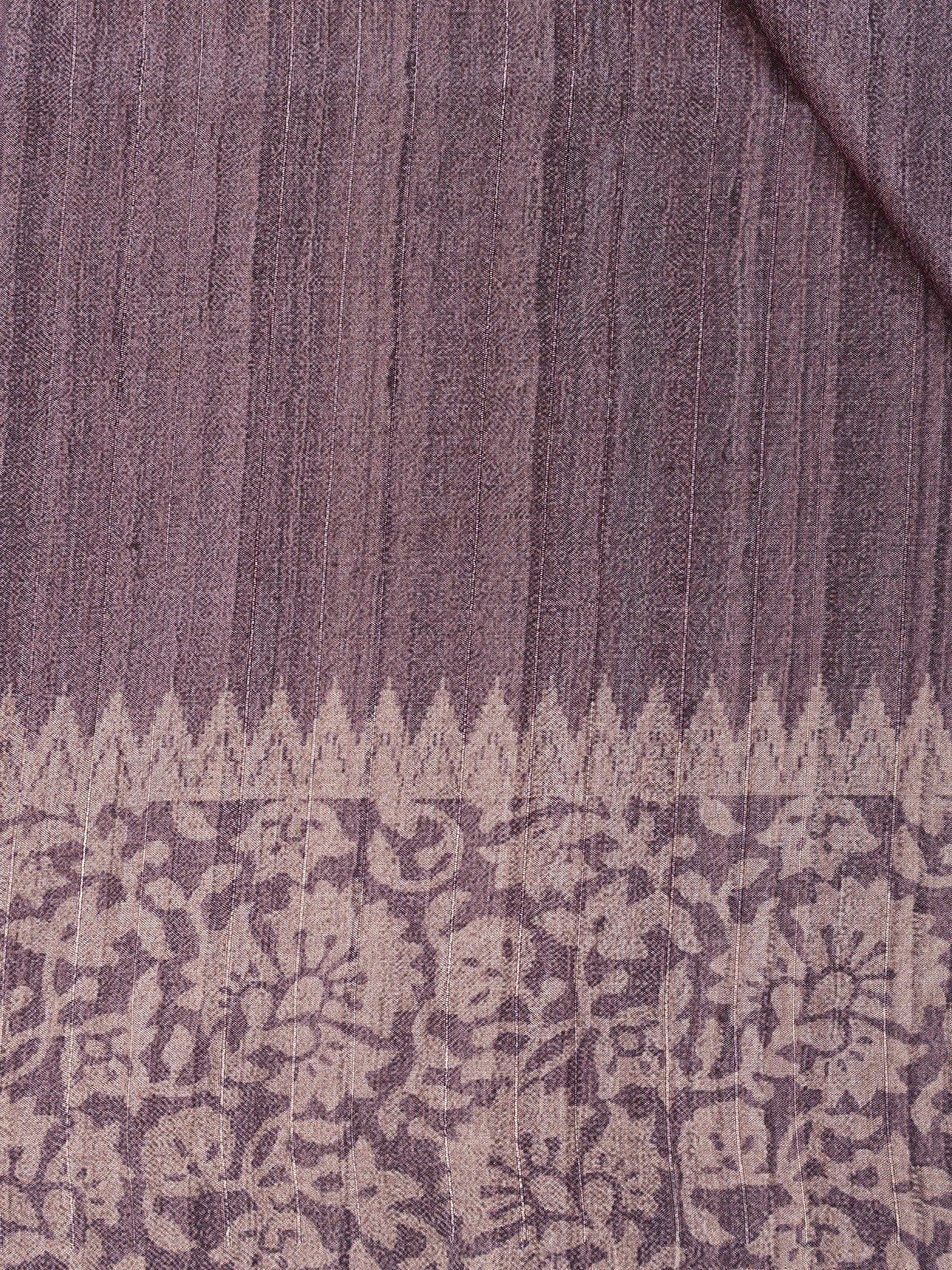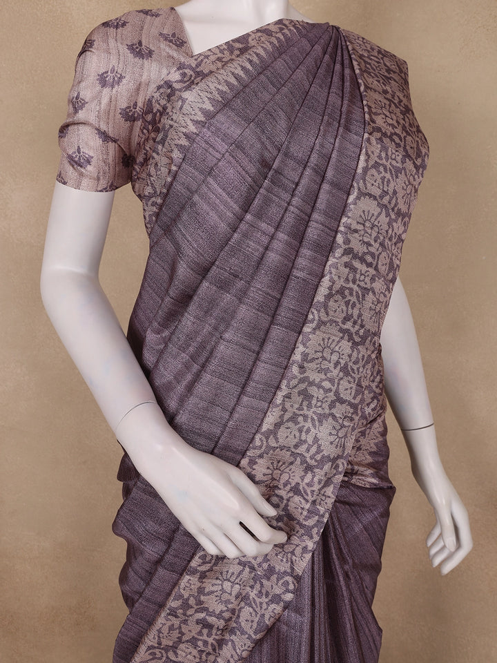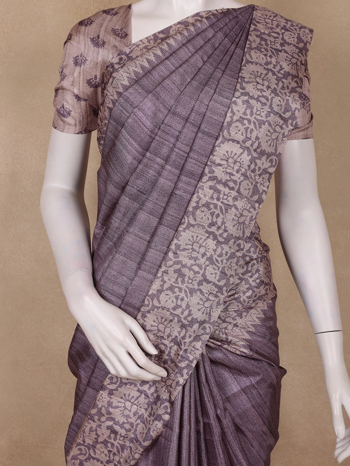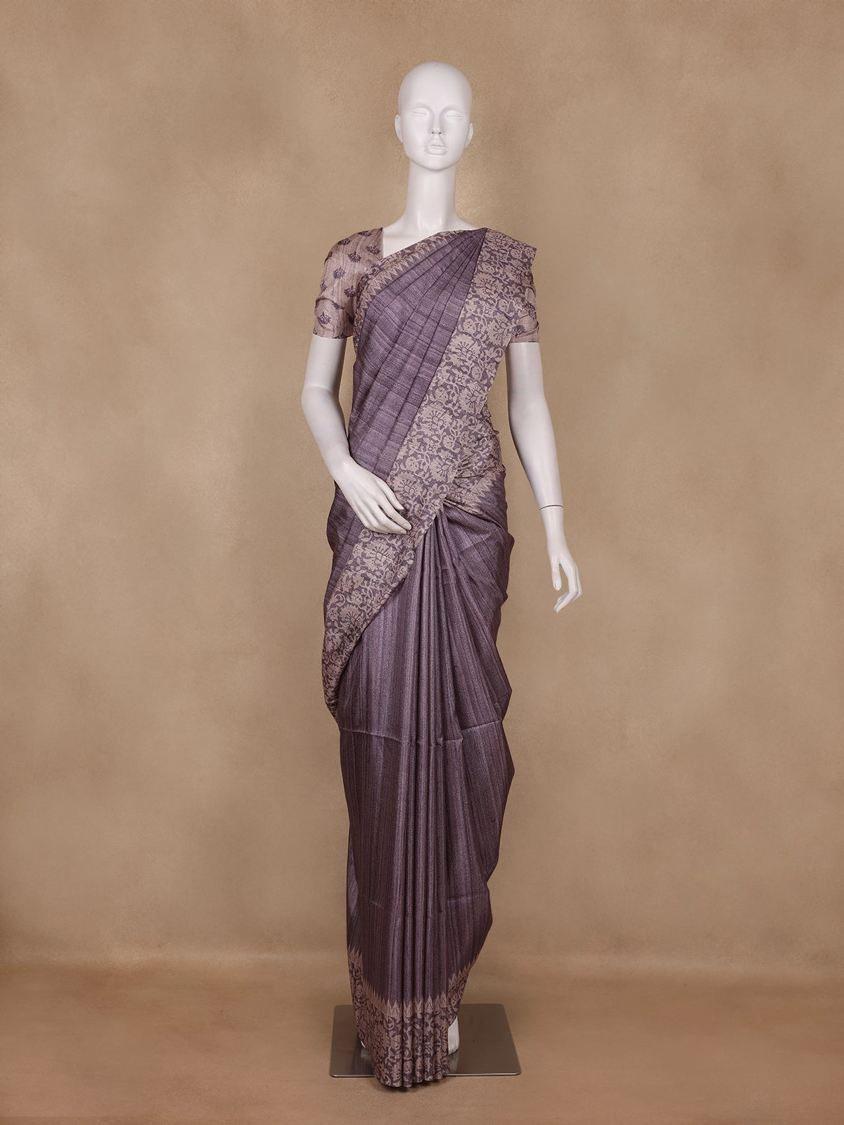 Make a graceful statement with this elegant Purple Semi Tussar Fancy Saree, a blend of traditional weaving and modern sophistication. Crafted from premium semi tussar fabric, the saree drapes beautifully, offering a soft sheen and refined finish that makes it perfect for festive and special occasions.