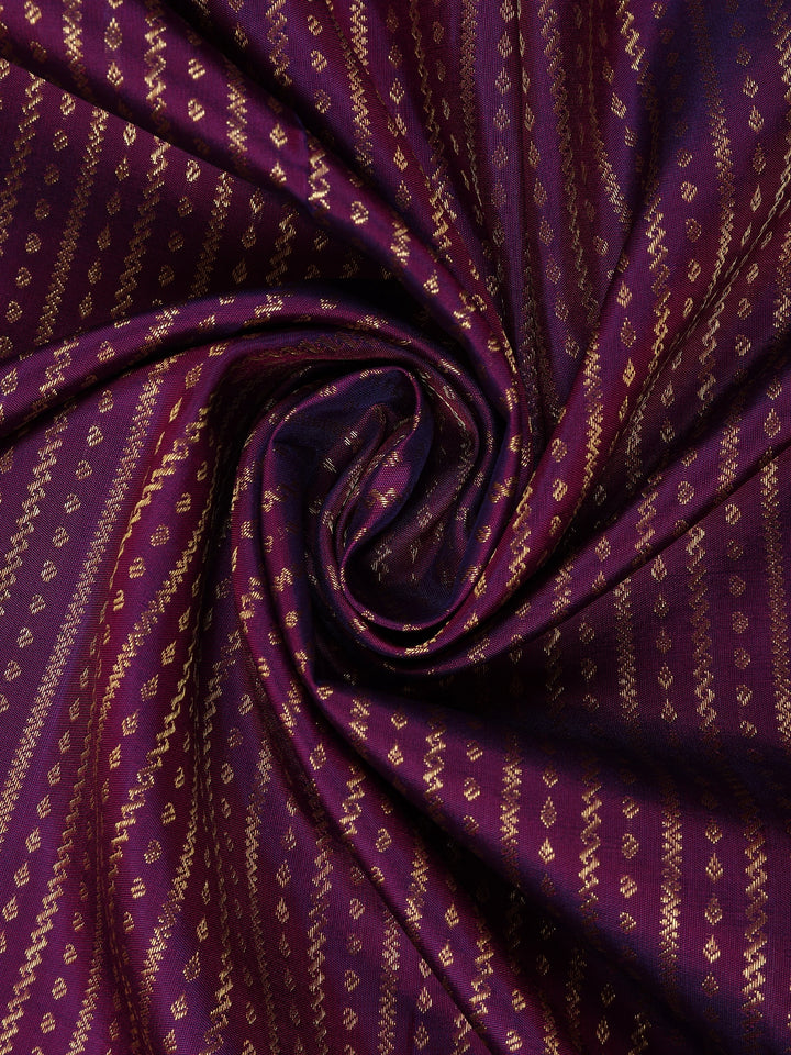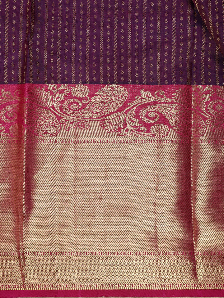 Grace your festive moments with this Purple Striped Zari Woven Kanchipuram Silk Saree, a stunning blend of traditional artistry and rich color contrast. The deep purple body is adorned with fine zari-striped weaving, exuding timeless elegance. A lustrous gold zari border beautifully frames the saree, while the vibrant pink pallu adds a striking contrast with intricate floral zari motifs that elevate its regal charm.