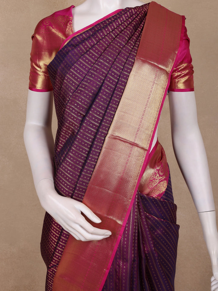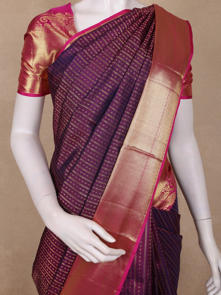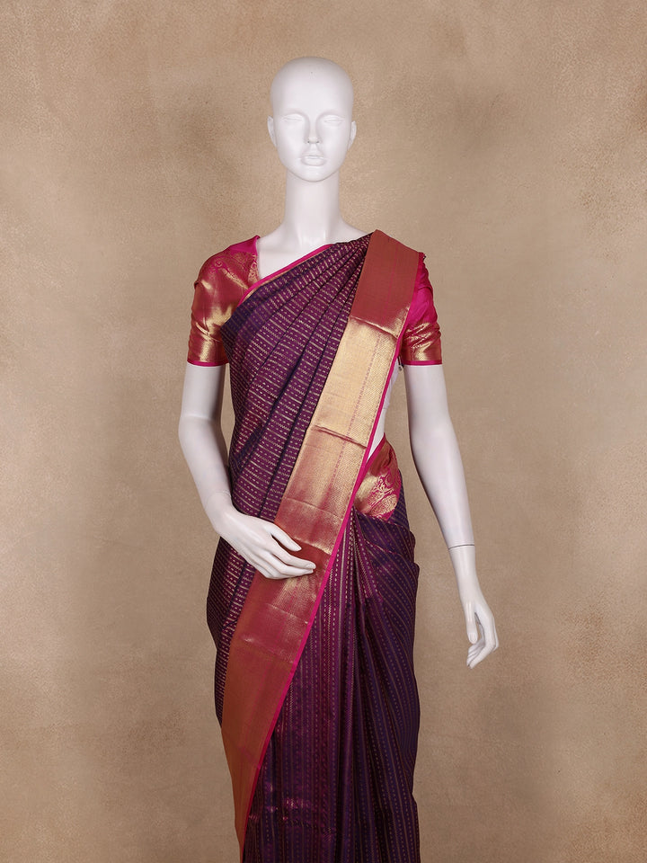 Purple Striped Zari Woven Kanchipuram Silk Saree With Contrast Pink Pallu And Border