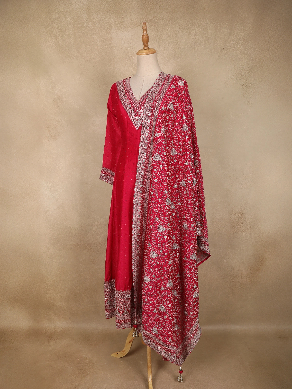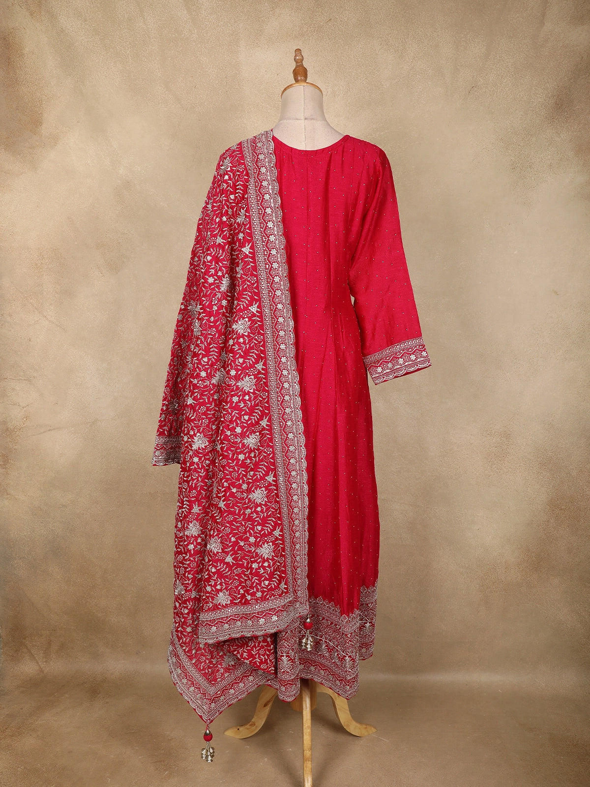 Completing the ensemble is a matching bottom designed for comfort and ease, along with a statement dupatta richly adorned with dense floral embroidery and finished with an ornate embroidered border. The contrast between the subtly dotted kurta and the heavily worked dupatta adds depth and visual richness to the outfit. Perfect for weddings, festive celebrations, and traditional occasions, this ensemble blends classic craftsmanship with contemporary elegance for a timeless ethnic look.
