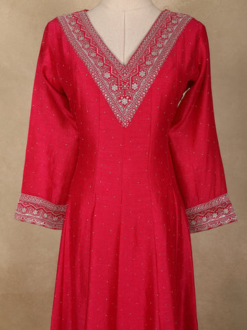 Radiating feminine elegance, this queen pink Anarkali salwar suit is crafted in a soft, flowy georgette fabric that offers graceful movement and a flattering drape. The kurta features delicate all-over dotted embellishments that add subtle shimmer, beautifully balanced with an intricately embroidered V-shaped neckline highlighted by fine zari and thread detailing. The Anarkali silhouette creates a graceful flare, enhancing the overall festive appeal.