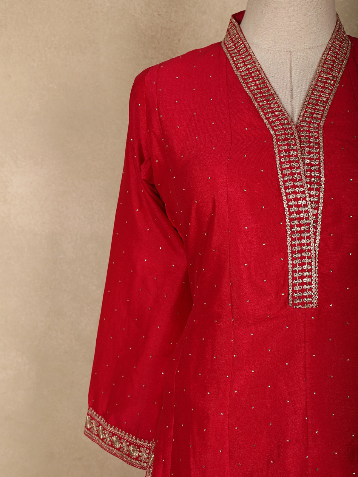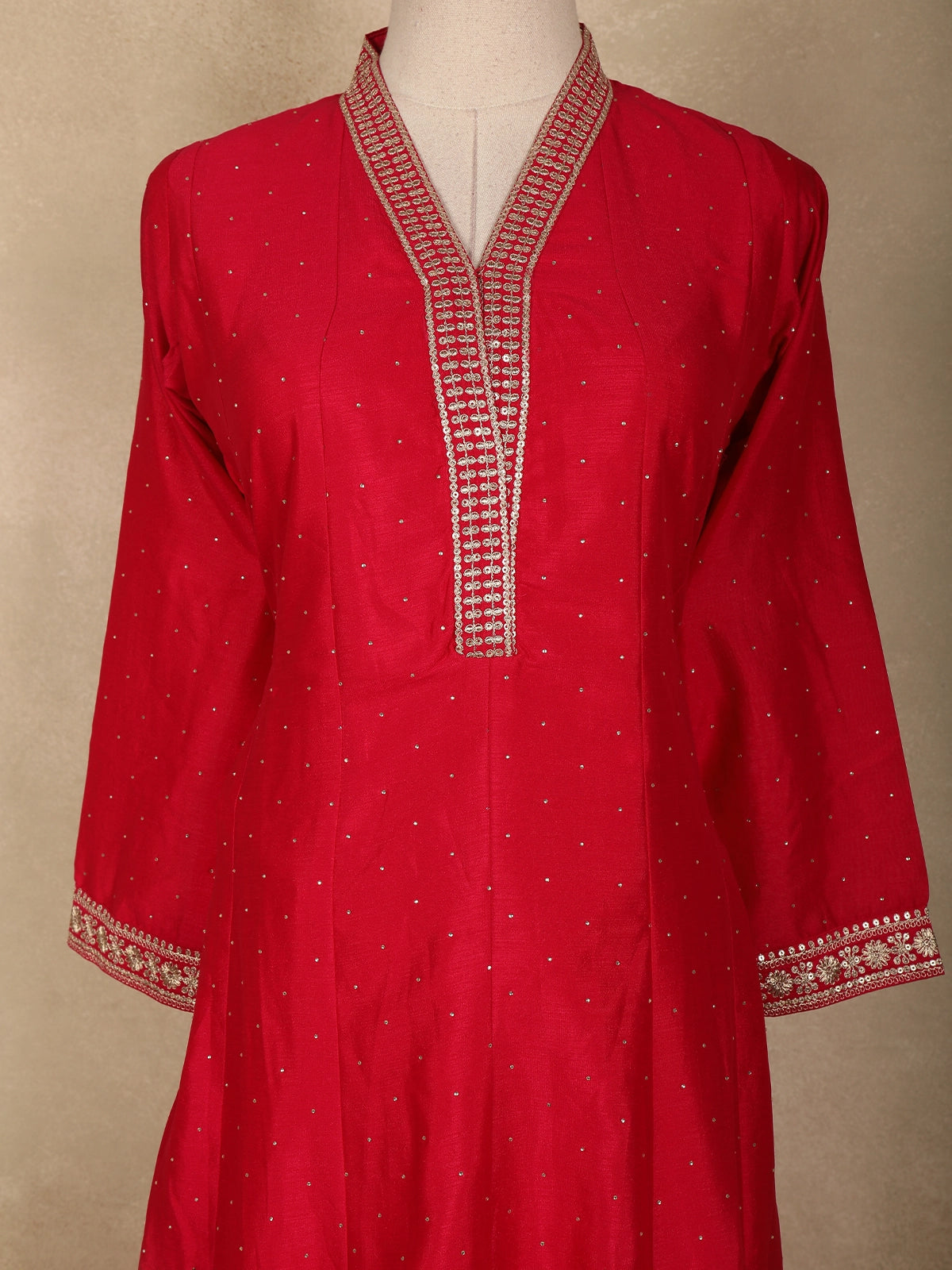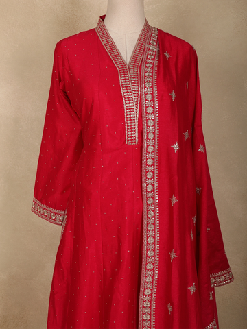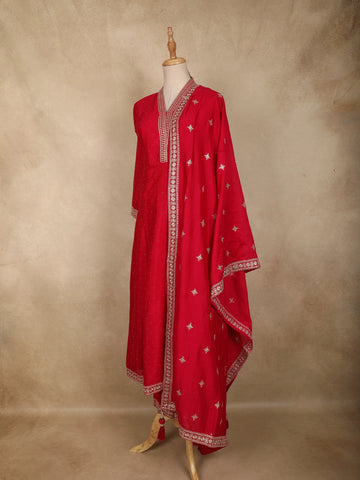 Designed in a classic straight silhouette, the kurta pairs effortlessly with a matching bottom that ensures ease of movement and a clean, structured look. Completing the ensemble is a coordinated georgette dupatta, embellished with scattered floral motifs and finished with an ornate embroidered border that elevates the overall appeal. Ideal for festive gatherings, weddings, and traditional occasions, this outfit beautifully blends feminine charm with timeless ethnic craftsmanship.