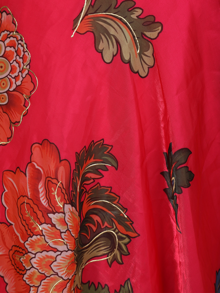 The sleeveless blouse is exquisitely enhanced with intricate thread and sequin embroidery, bringing a touch of shimmer and luxe detailing to the bold floral motifs. The set is paired with a coordinating organza dupatta, softly draping over the shoulder to complete the ensemble with effortless grace.
