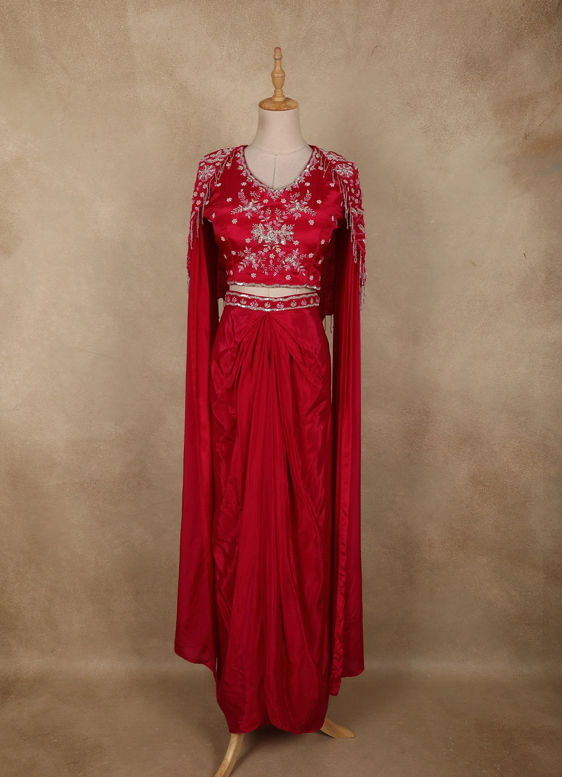 The crepe silk skirt drapes effortlessly with soft gathers that create a fluid, flattering fall. Its smooth texture and rich color lend a sophisticated finish, making it both comfortable and visually striking. A neatly embellished waistband adds subtle definition and completes the look seamlessly.