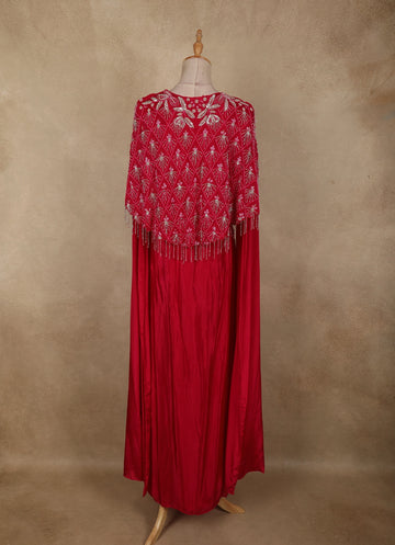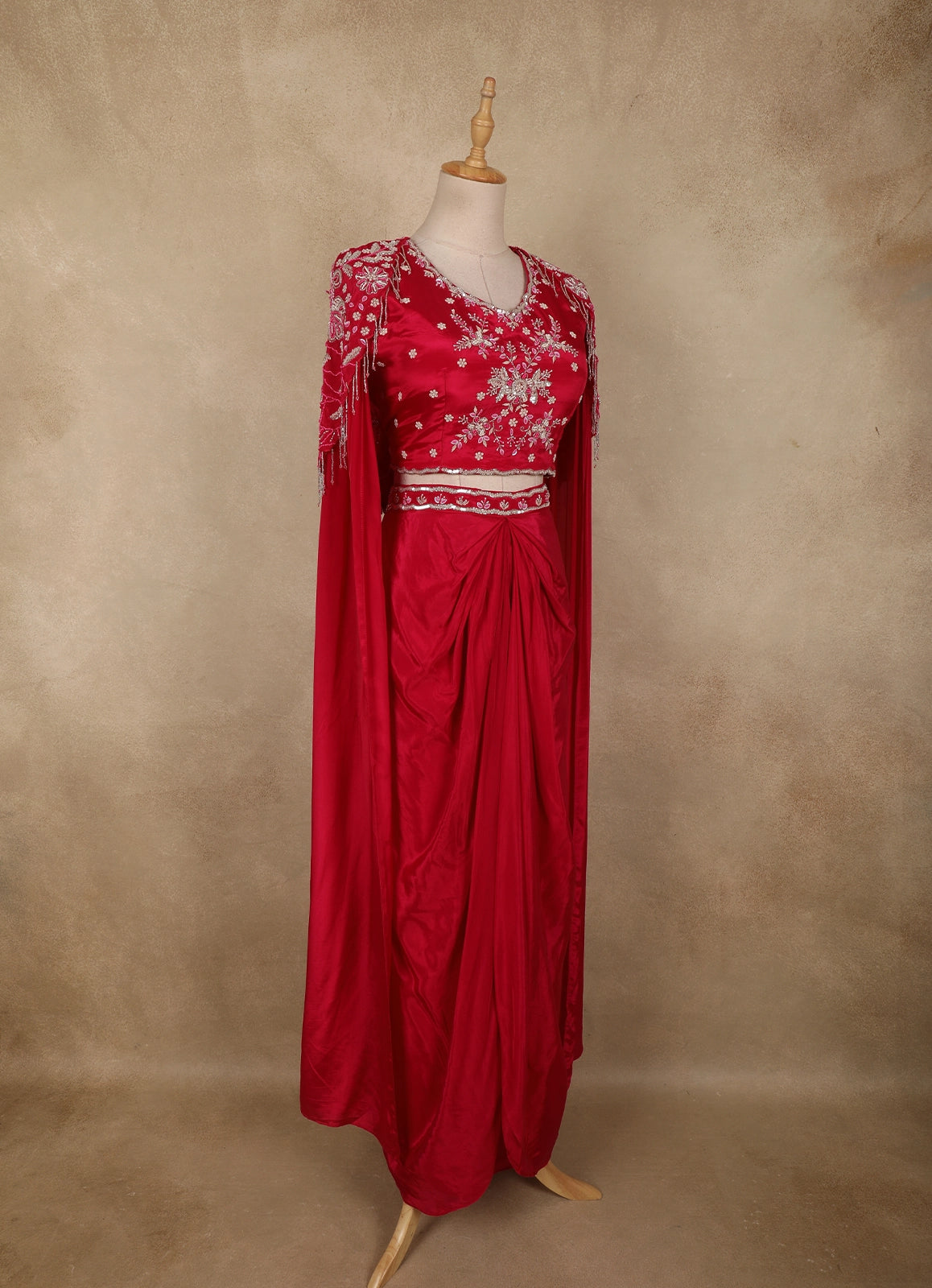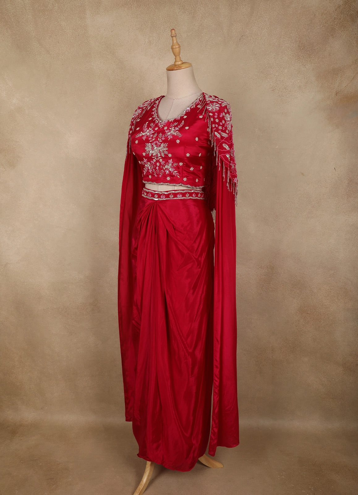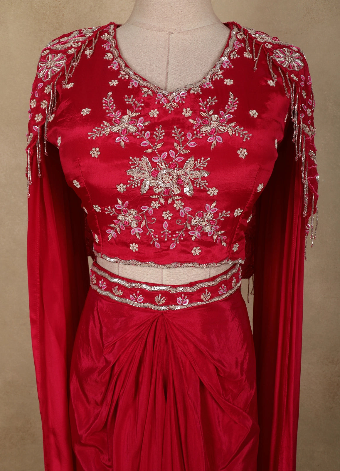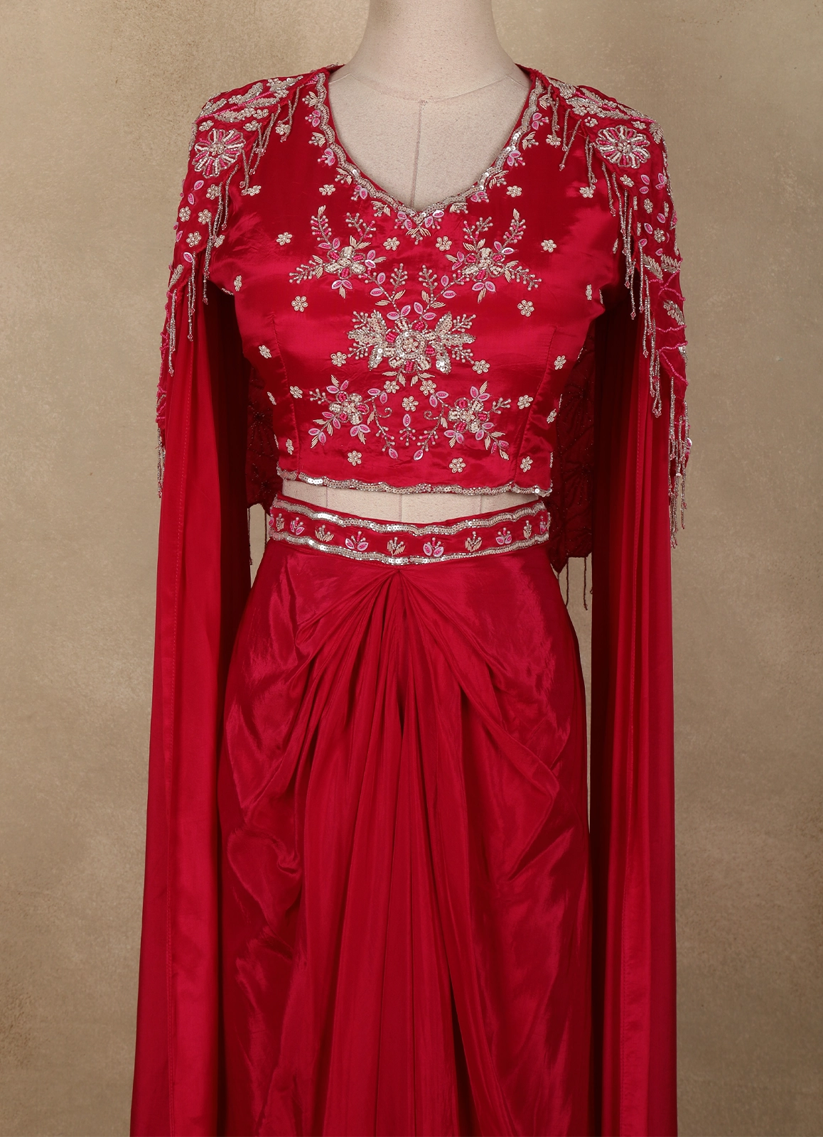 The blouse is exquisitely crafted with intricate floral embroidery, highlighted by fine sequins and bead detailing that create a luminous, handcrafted appeal. The delicately finished neckline enhances the overall grace of the silhouette, while the coordinated embroidery extending onto the cape-style sleeves adds a dramatic yet elegant flow to the ensemble.