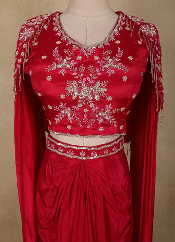 Radiating timeless elegance, this Queen Pink crepe silk skirt-top set is designed to make a refined festive statement. The rich queen pink hue brings a regal charm, beautifully complemented by shimmering embellishments that add just the right touch of glamour.