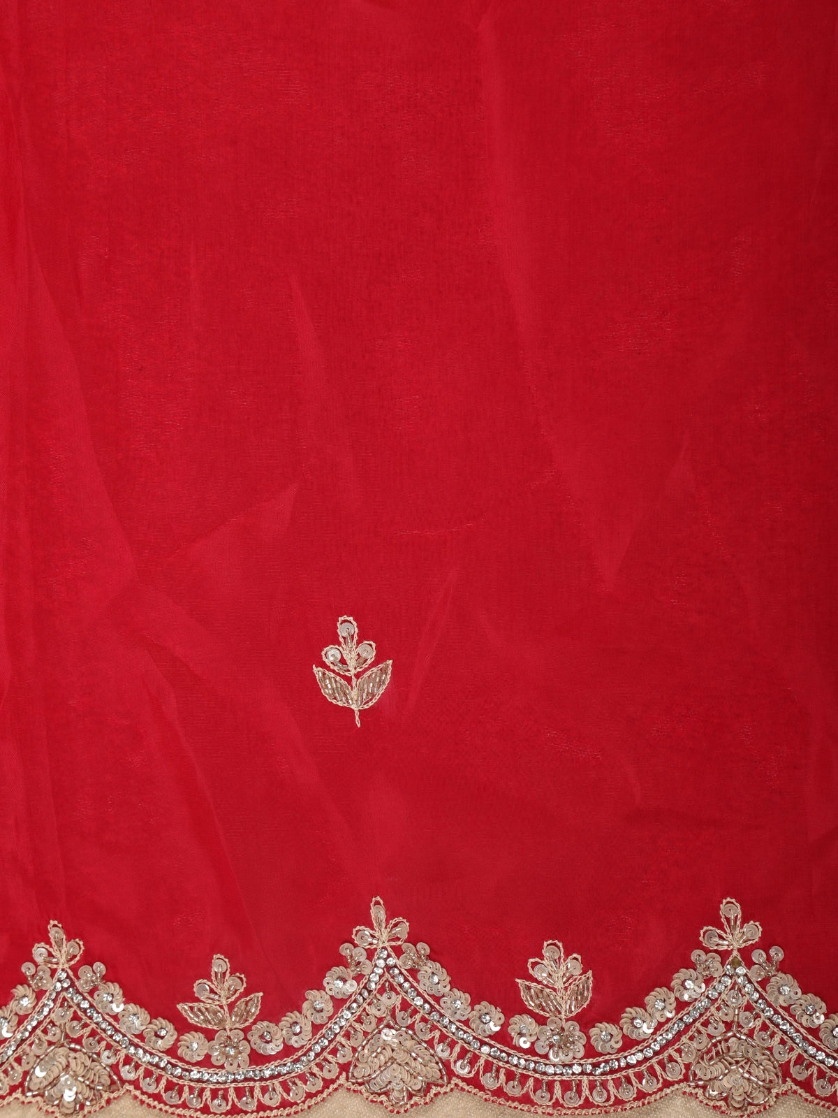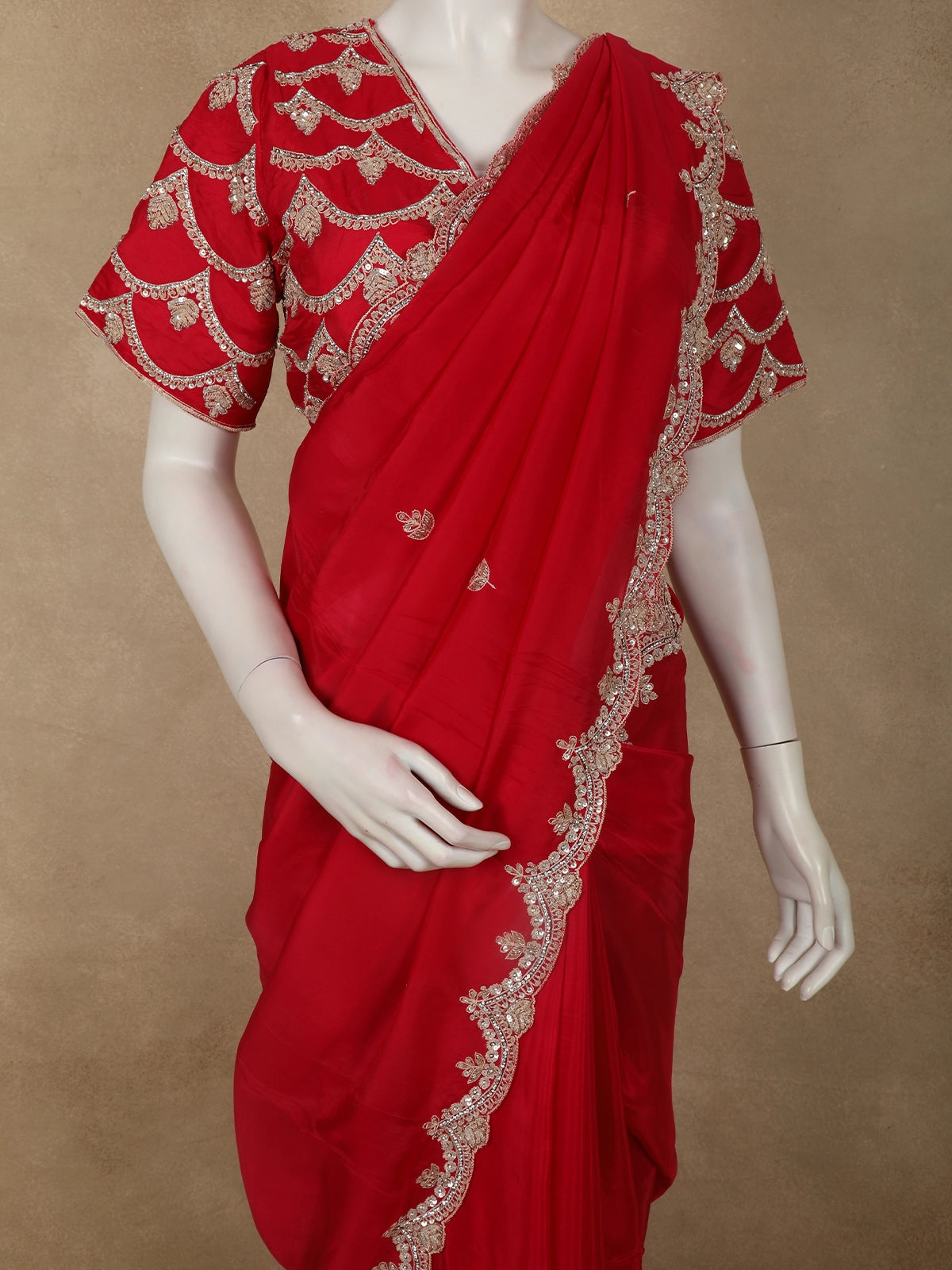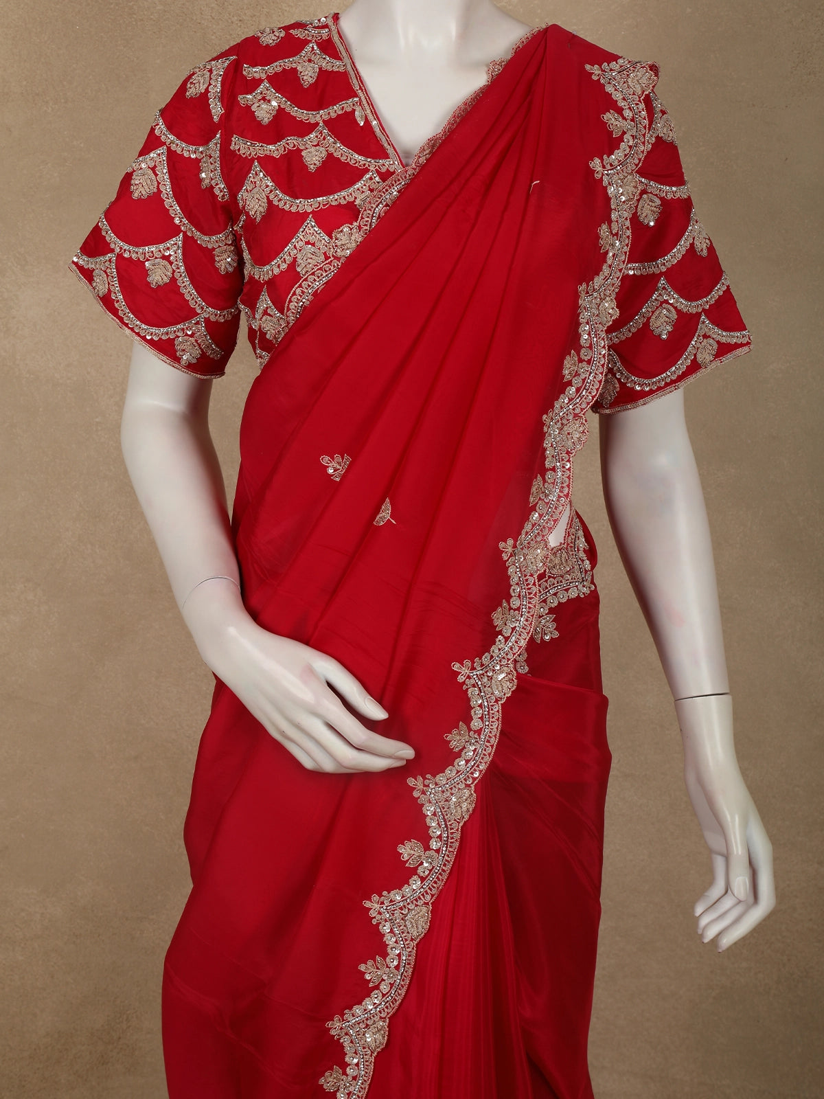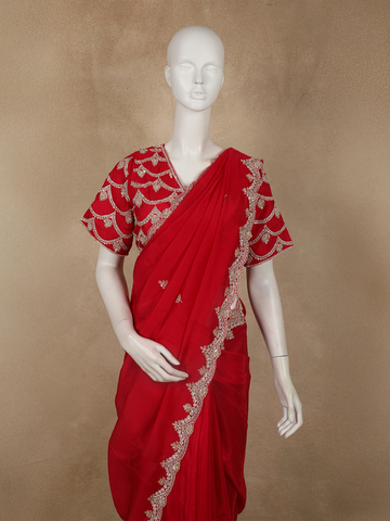 The body is beautifully enhanced with intricate floral embroidery, highlighted using sequins and delicate beadwork that add a refined shimmer across the drape. The embroidery is thoughtfully placed to create a balanced, couture-inspired look without overwhelming the rich colour. Elevating the saree further is a scalloped designer border, densely embellished with sequins and beads for a luxurious finish.