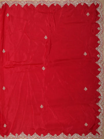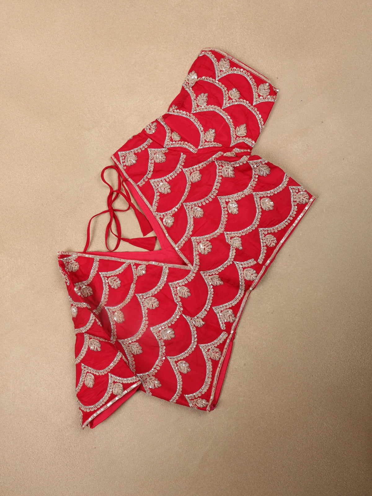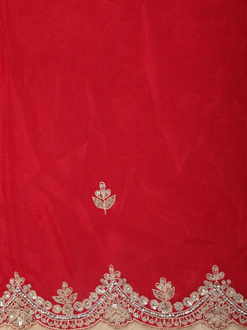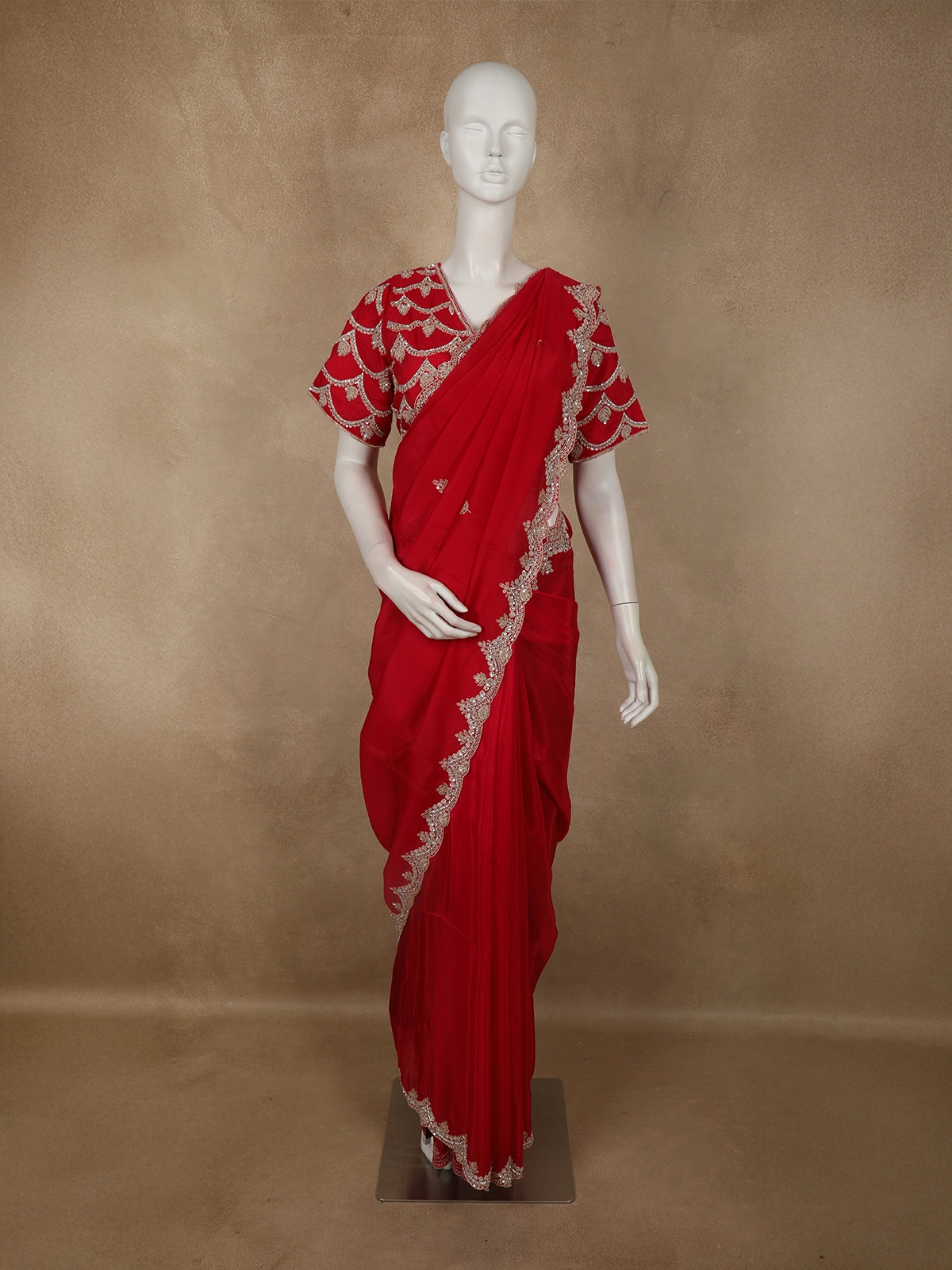 The body is beautifully enhanced with intricate floral embroidery, highlighted using sequins and delicate beadwork that add a refined shimmer across the drape. The embroidery is thoughtfully placed to create a balanced, couture-inspired look without overwhelming the rich colour. Elevating the saree further is a scalloped designer border, densely embellished with sequins and beads for a luxurious finish.