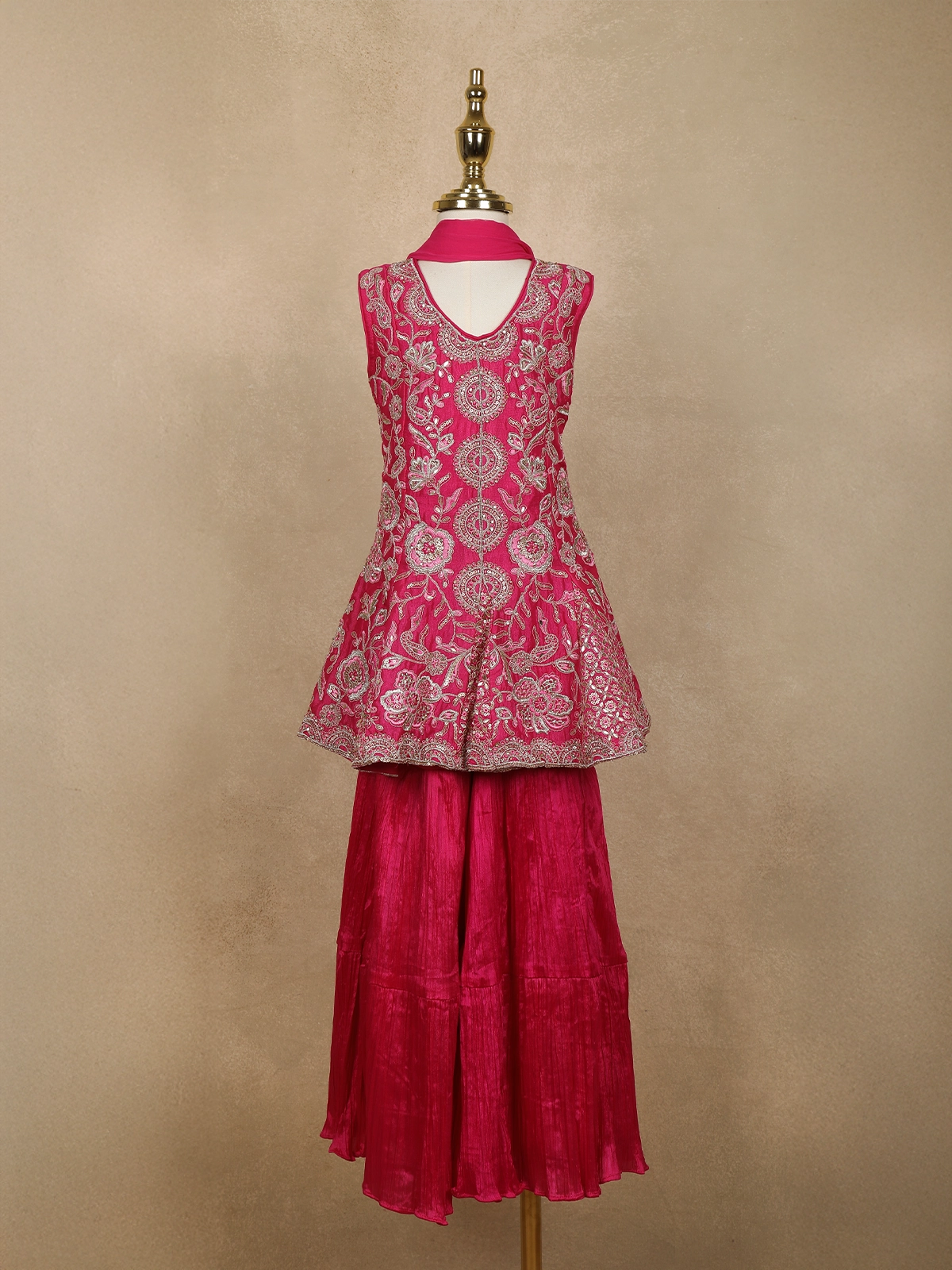 Paired with a matching sharara bottom, the ensemble offers both comfort and style. The sharara features a flowy structure that allows easy movement, making it ideal for kids during celebrations. Completing the look is a coordinated dupatta, adding grace and a traditional finishing touch to the outfit.