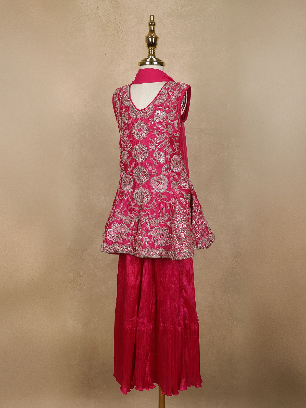 Perfect for weddings, festive celebrations, birthday functions, and traditional occasions, this sharara suit stands out with its vibrant queen pink hue and ornate craftsmanship. A delightful choice for festive dressing that balances elegance, comfort, and timeless charm.