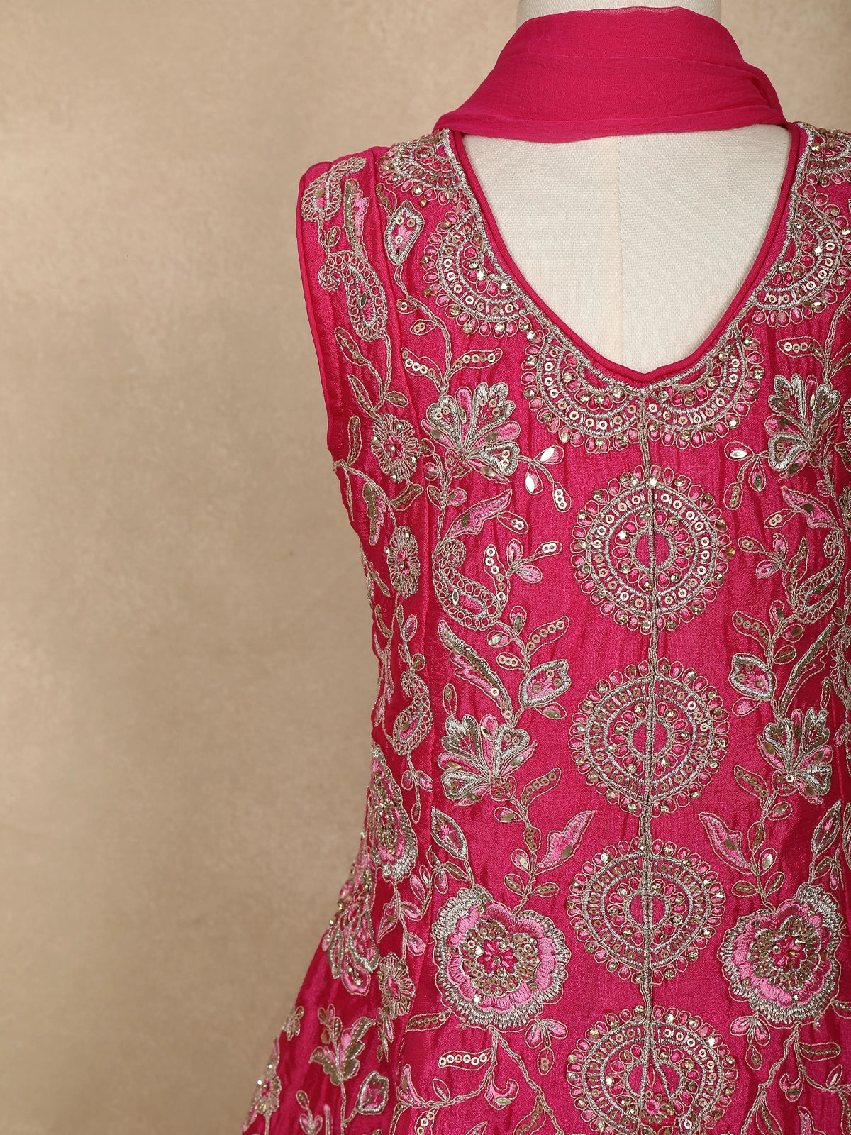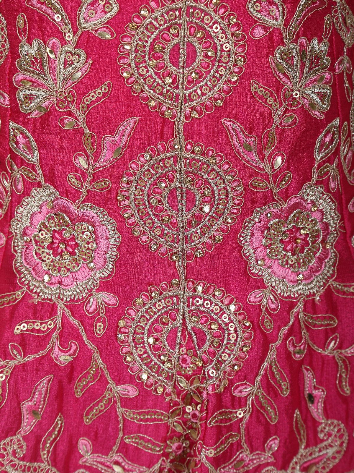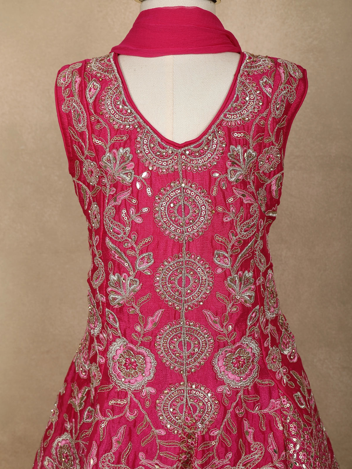 The kurta is beautifully adorned with intricate floral embroidery, featuring a harmonious combination of fine thread work and shimmering sequins. Delicate circular and floral motifs are arranged in an elegant pattern, adding depth and richness to the design. The detailed embroidery around the neckline, bodice, and hemline lends a regal finish, while the flared silhouette adds a charming festive touch.