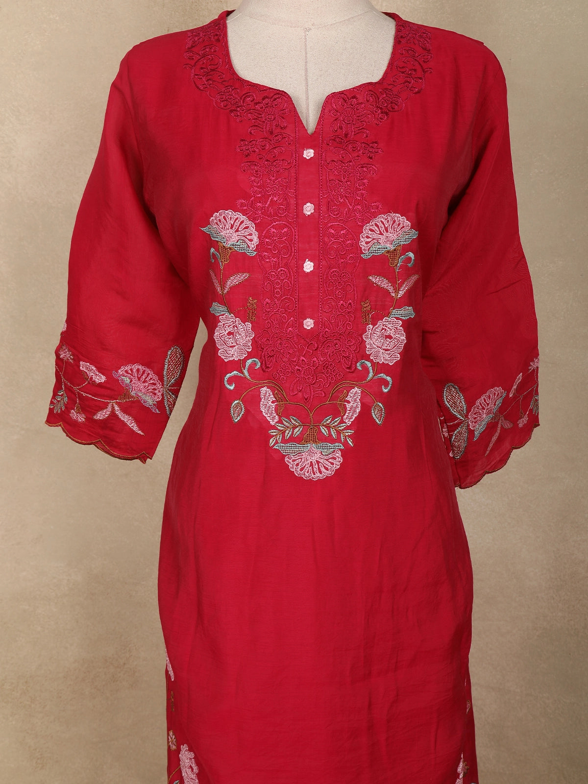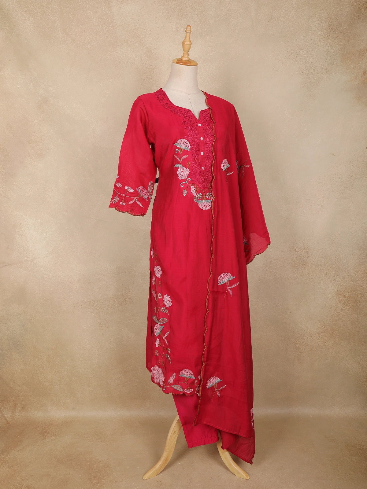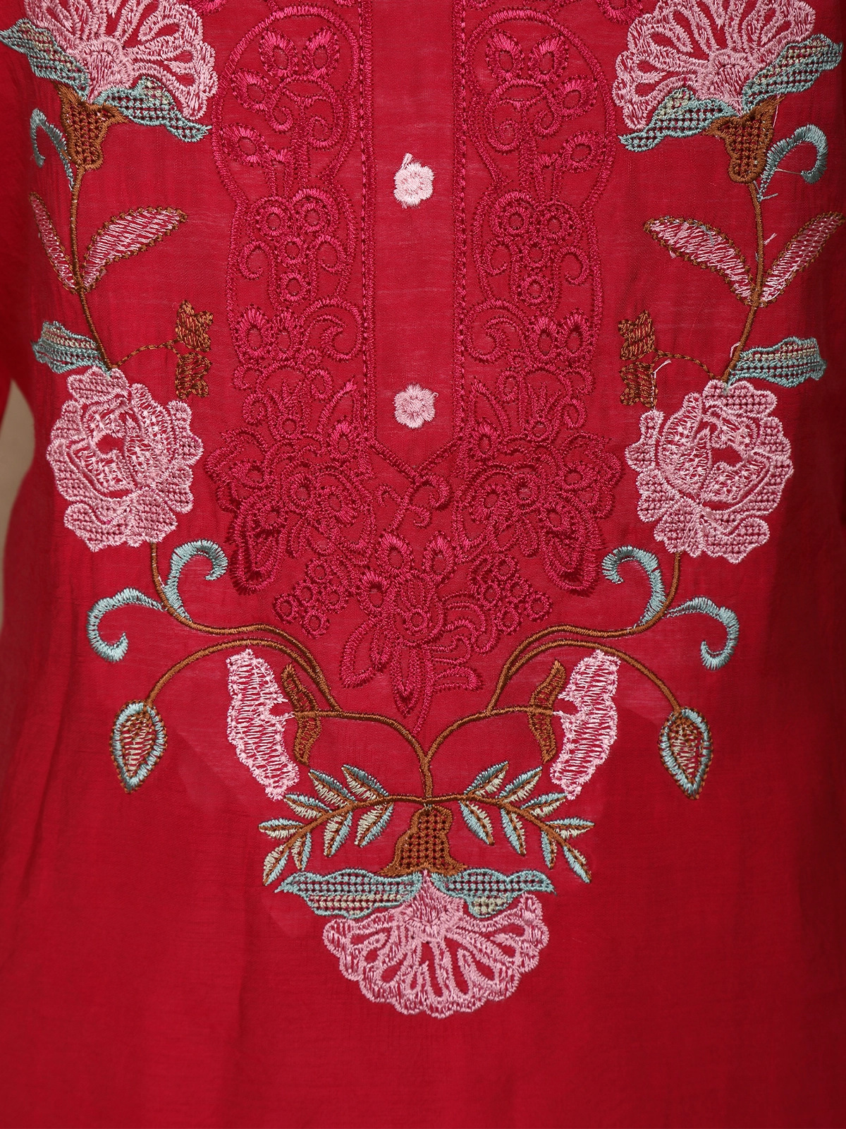 Step into effortless elegance with this Queen Pink Floral Thread Embroidered Cotton Salwar Suit, crafted to bring comfort and charm together in the most graceful way. The soft cotton kurta is adorned with delicate multicolour floral thread embroidery across the yoke, sleeves, and hem, adding an artisanal touch to its vibrant tone.
