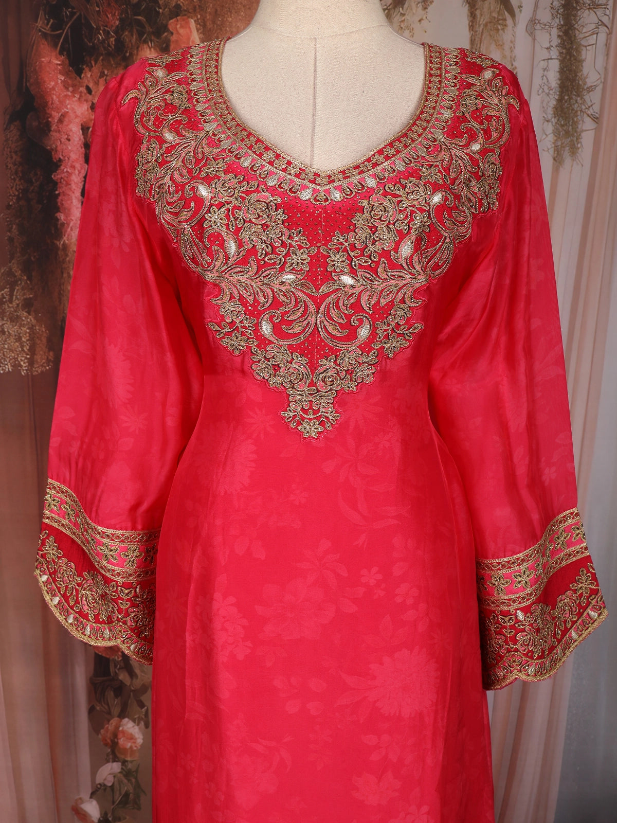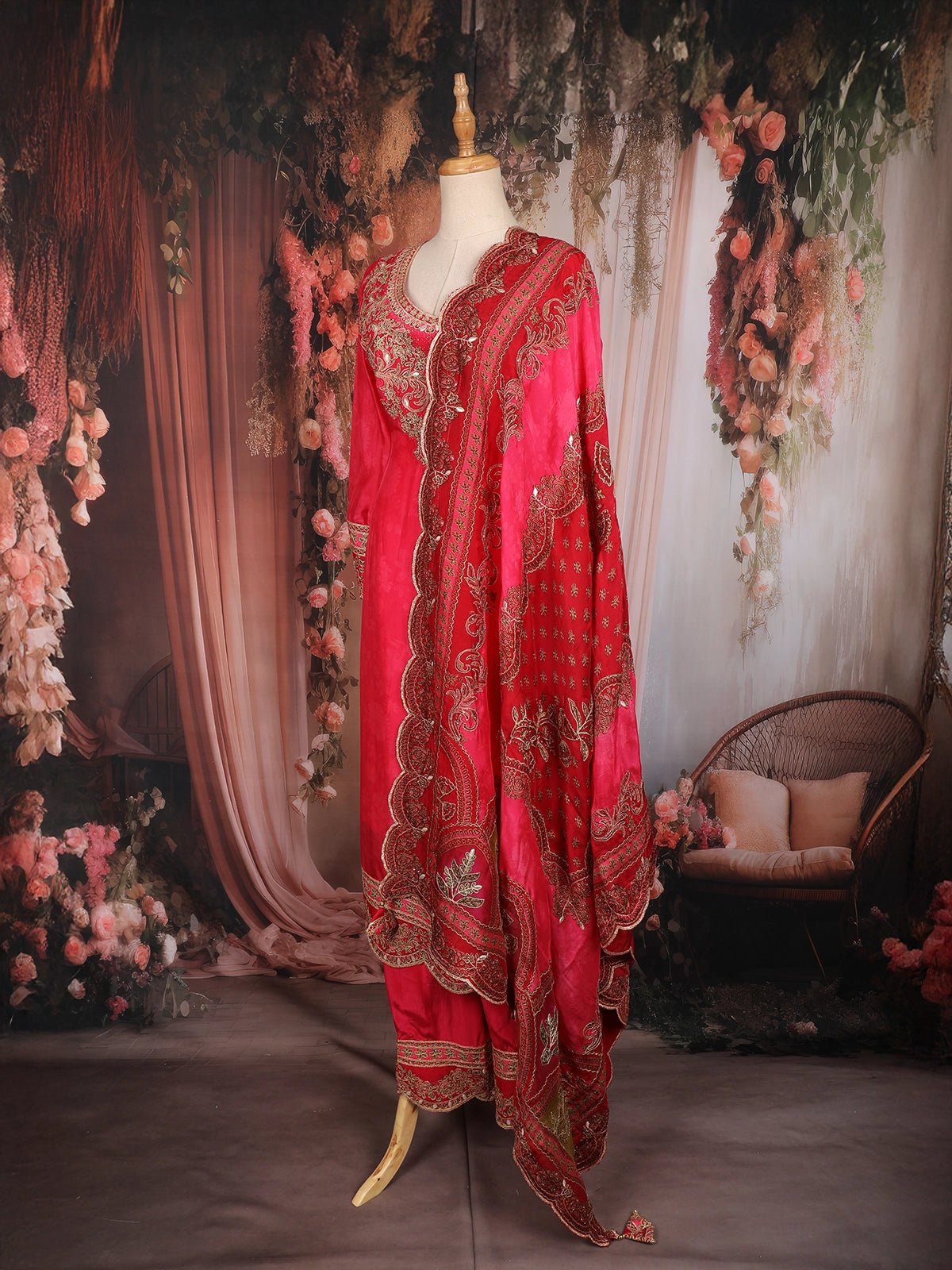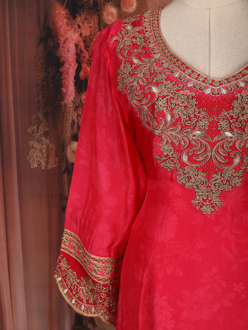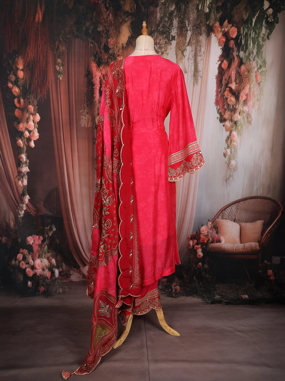 Make a graceful statement with this stunning queen pink palazzo suit, crafted to bring together traditional artistry and contemporary elegance. The kurta is beautifully adorned with intricate floral zari embroidery, highlighted with delicate detailing that adds a rich, festive charm to the vibrant pink base. The ornate embroidery along the neckline, borders, and panels enhances the overall grandeur of the outfit.