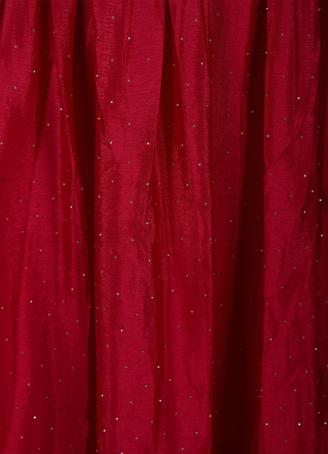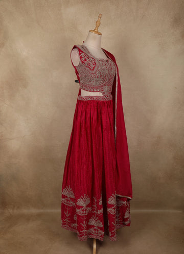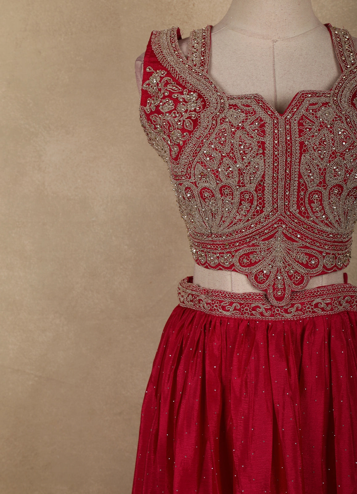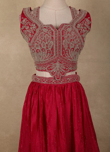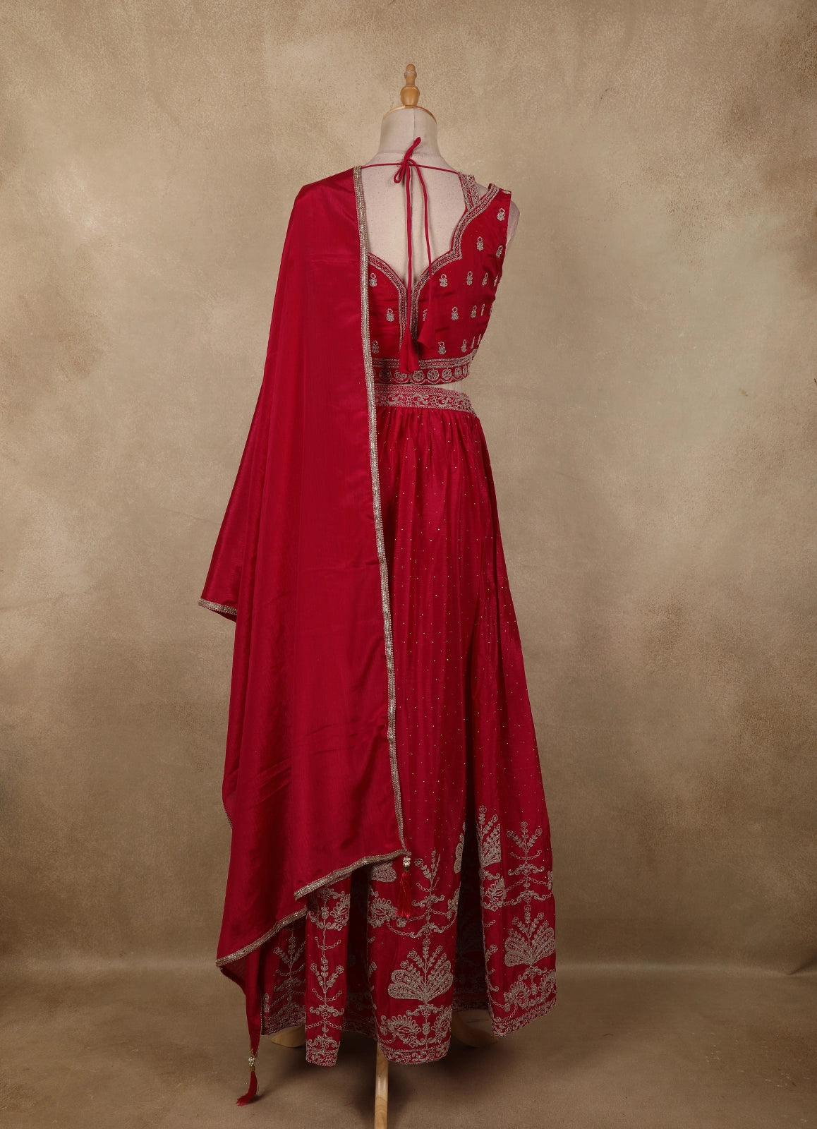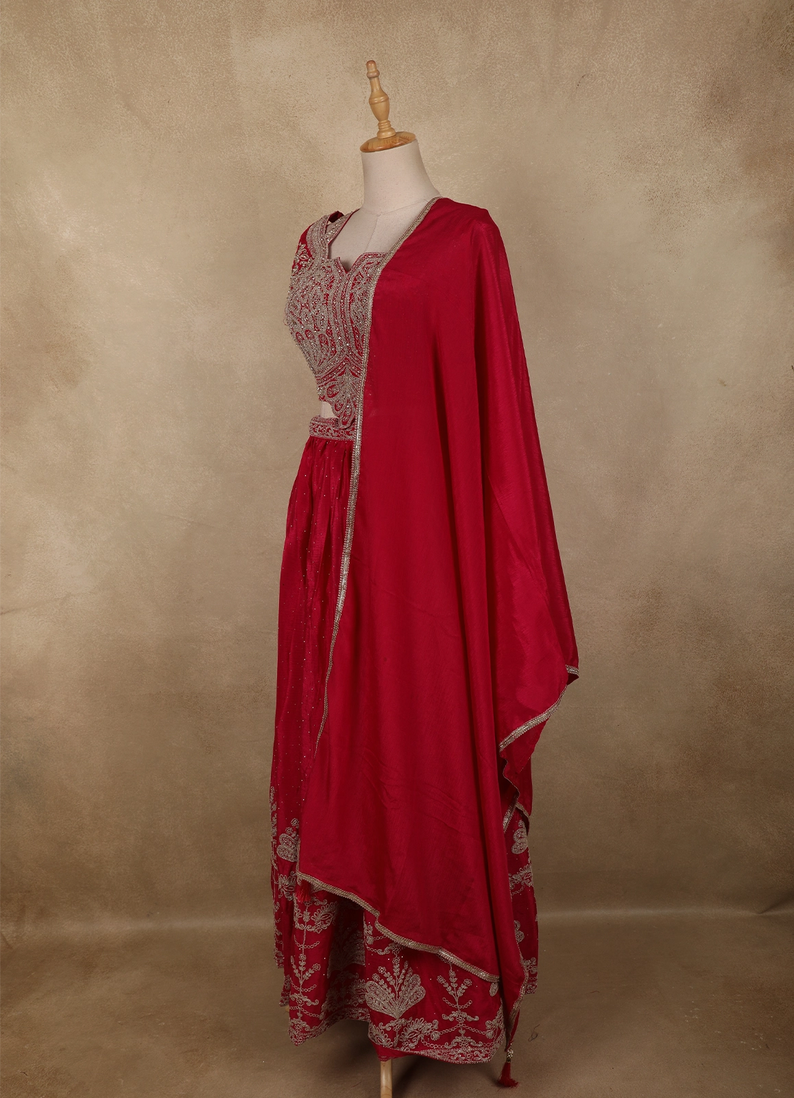 This exquisite lehenga set is crafted in a rich queen pink semi silk, radiating festive elegance with a soft natural sheen. The lehenga skirt is beautifully enhanced with intricate floral zari embroidery, accented with delicate shimmer detailing that adds depth and richness to the overall look. The finely embroidered hemline lends a graceful finish, creating a regal silhouette with every movement.