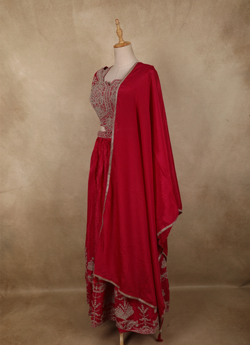The blouse showcases elaborate zari embroidery with ornate floral patterns, designed to highlight the neckline and bodice with a luxurious handcrafted appeal. Paired with this is a matching dupatta, finished with a subtle zari border that adds a refined touch while maintaining a fluid and elegant drape.
