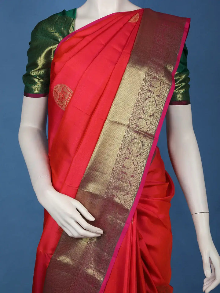 The contrast green pallu, intricately detailed with zari work, adds a captivating touch of regality to the drape, while the rich golden zari border frames the saree with finesse. Complemented by a contrast green blouse piece with zari detailing, this ensemble achieves a harmonious balance of vibrance and sophistication.