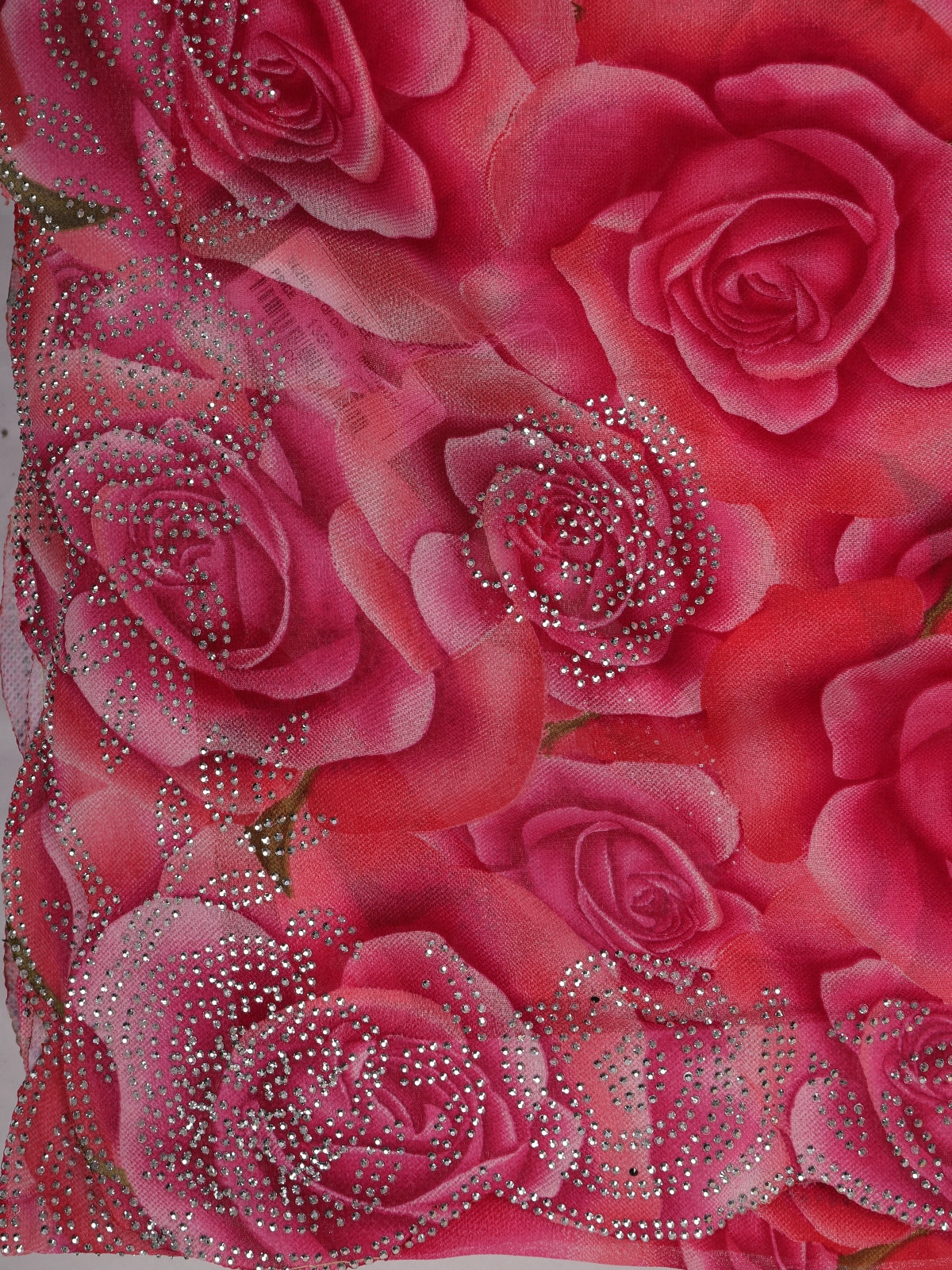 Queen Pink Rose Floral Printed Chiffon Saree with Stone Embellished Scallop Border