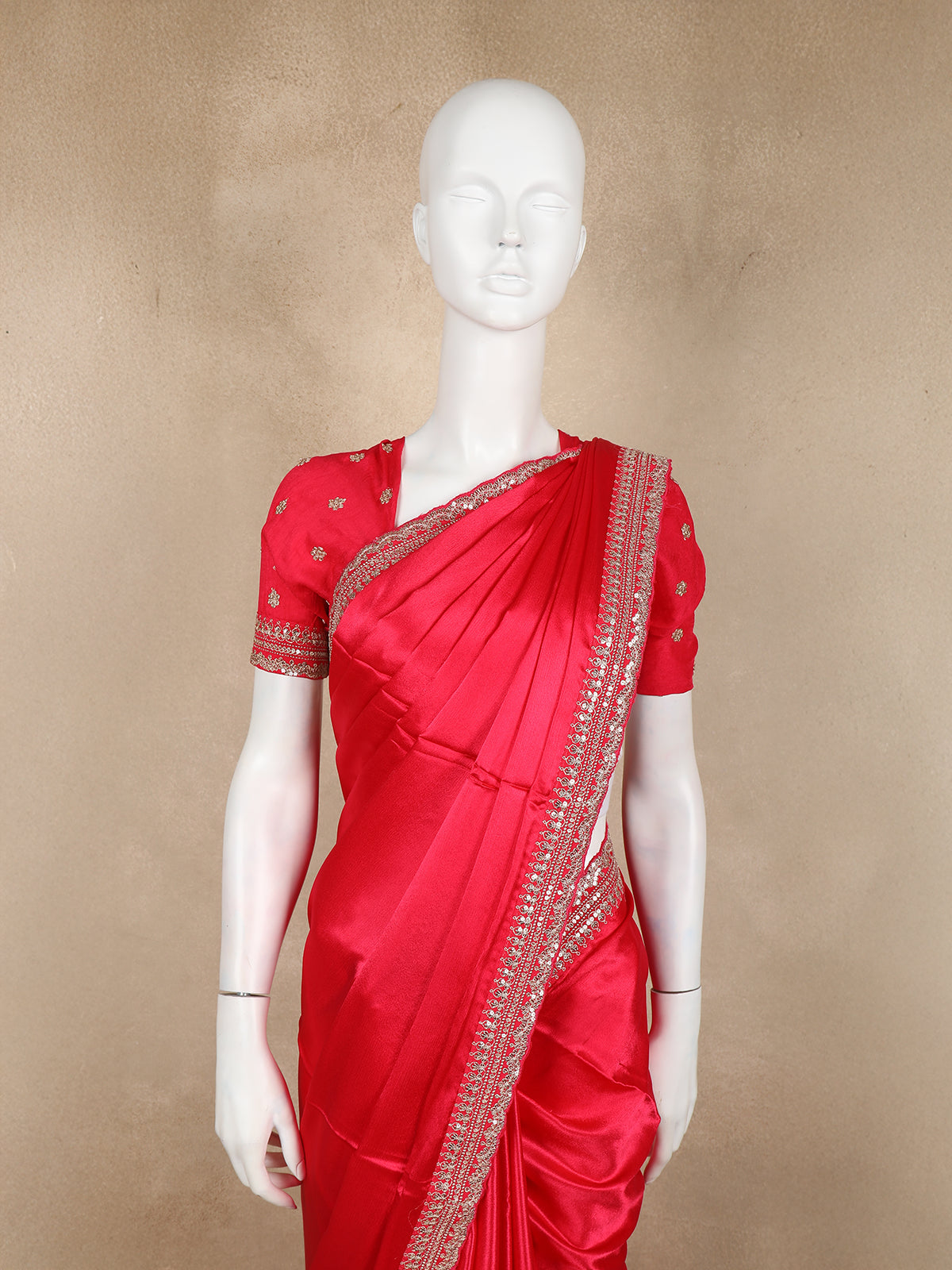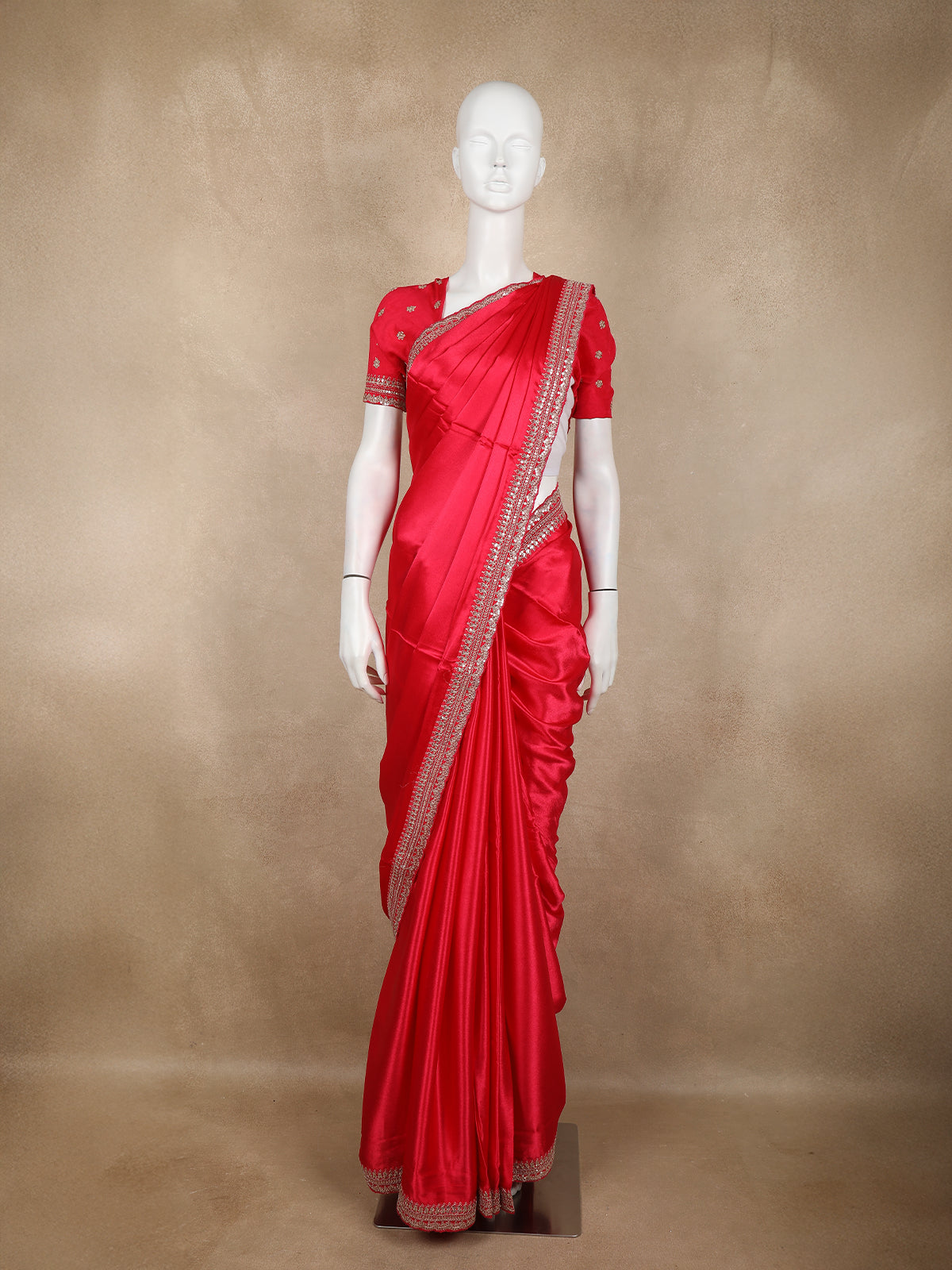 The look is elevated with a meticulously designed border, intricately detailed to add just the right amount of opulence and structure. Paired with a stunning velvet blouse, richly adorned with intricate floral patterns, the combination of textures—sleek satin and plush velvet—creates a regal balance between tradition and modernity.