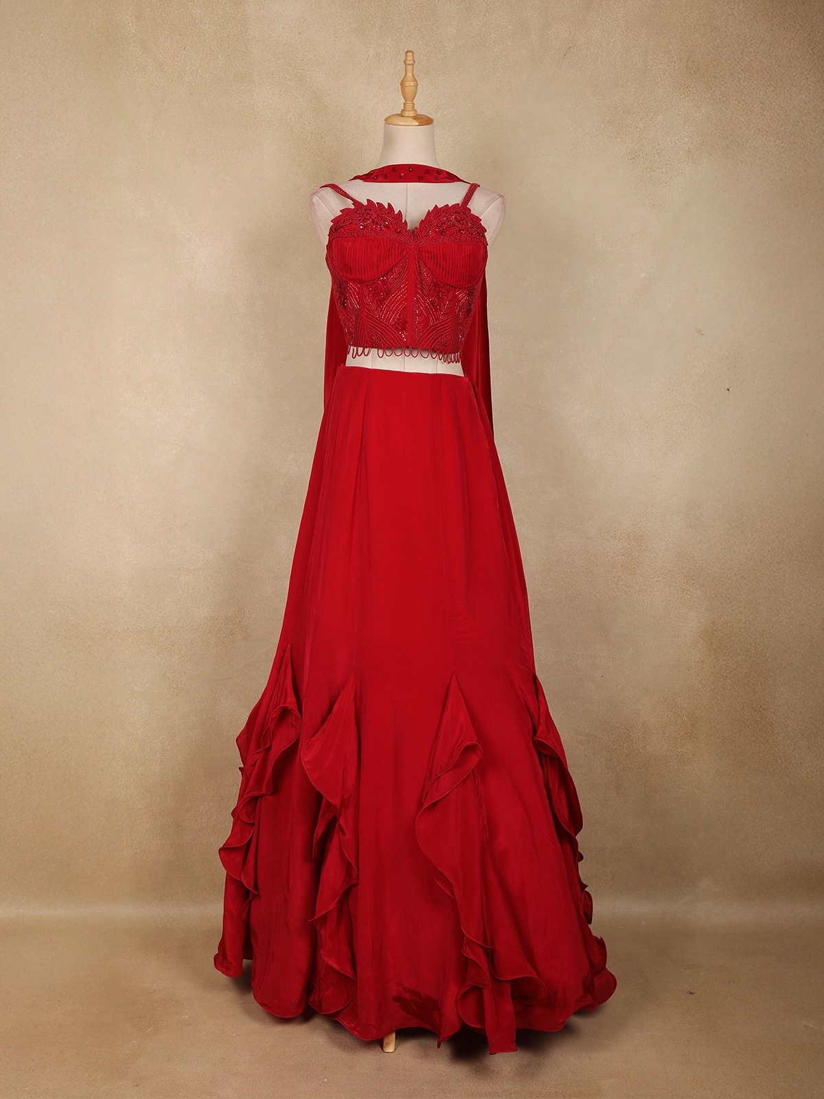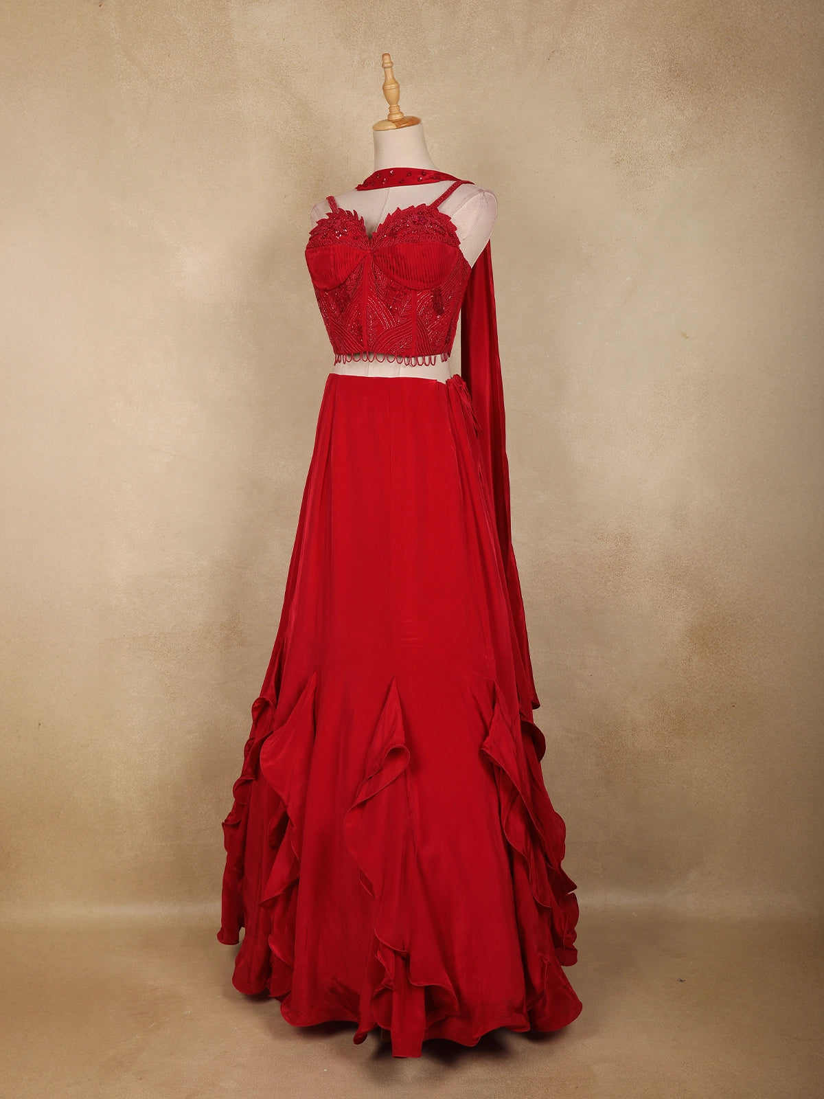 The lehenga skirt flows into a dramatic flare, enhanced with soft cascading ruffle detailing at the hemline. These layered ruffles add volume, movement, and a touch of glamour, making the outfit visually striking from every angle.