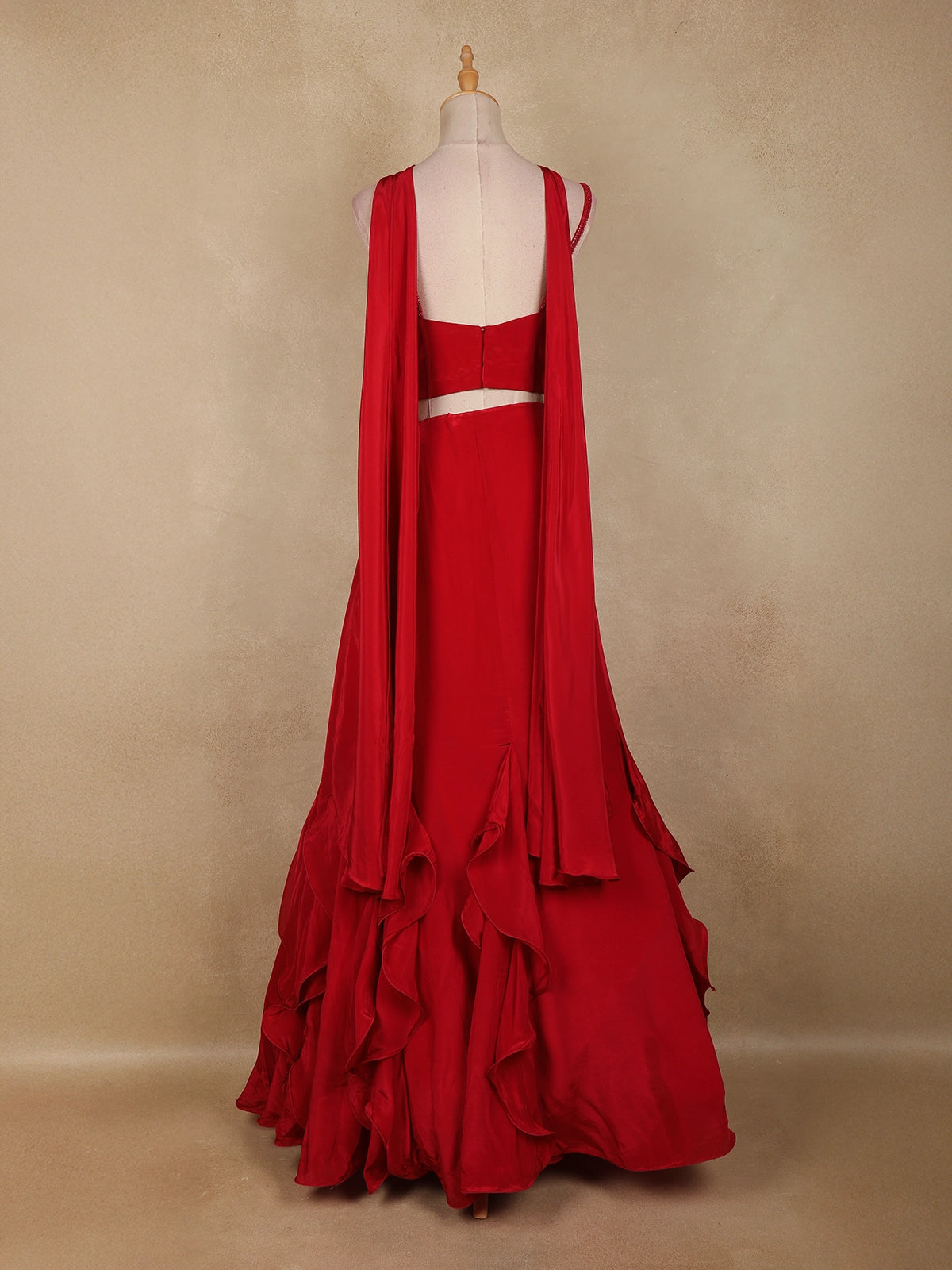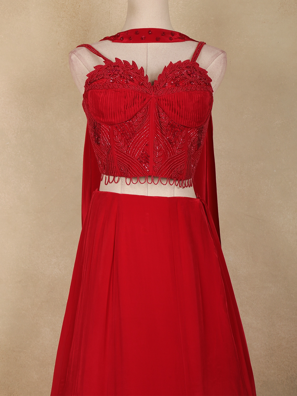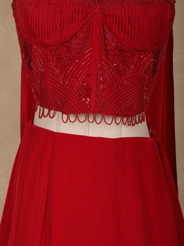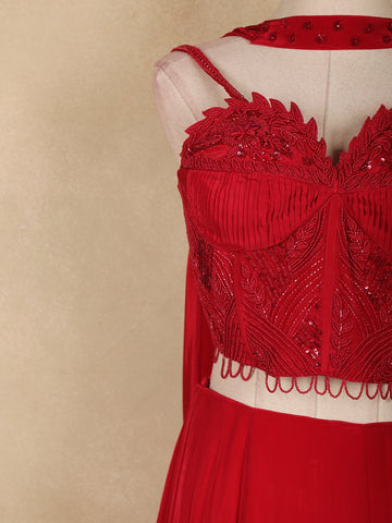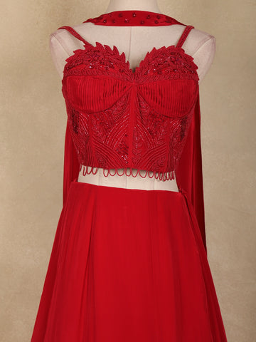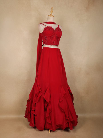 Perfect for receptions, cocktail parties, sangeet nights, festive occasions, and evening celebrations, this red satin lehenga pairs effortlessly with statement jewellery and heels. A beautiful blend of contemporary design, rich embellishment, and timeless elegance, this Indo-western lehenga is a standout choice for special occasions.