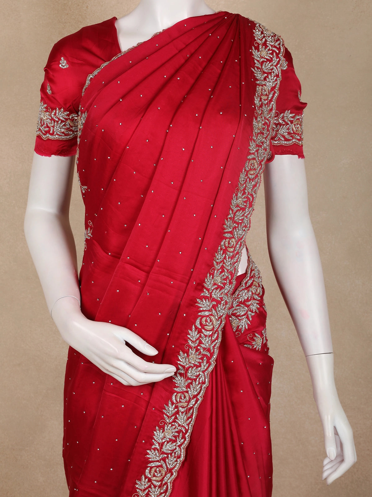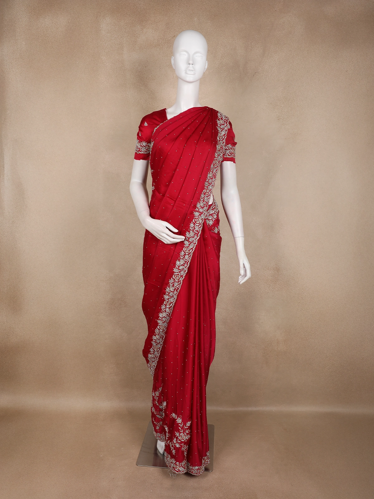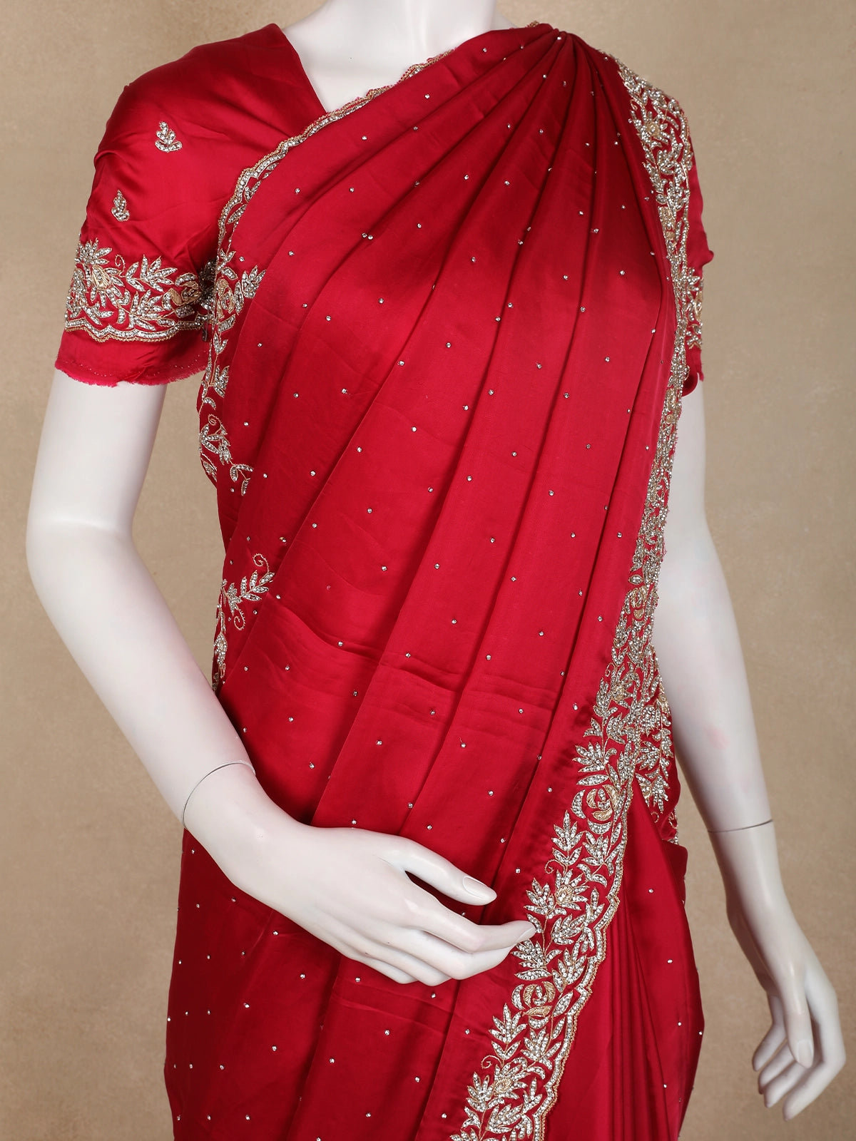 The luxurious satin fabric drapes beautifully, offering a smooth, glossy finish that enhances the richness of the deep red hue. The saree is adorned with delicate sequins and bead embroidery, thoughtfully arranged to add subtle sparkle without overpowering the overall look. A finely embroidered border elevates the design, lending a graceful and festive appeal.