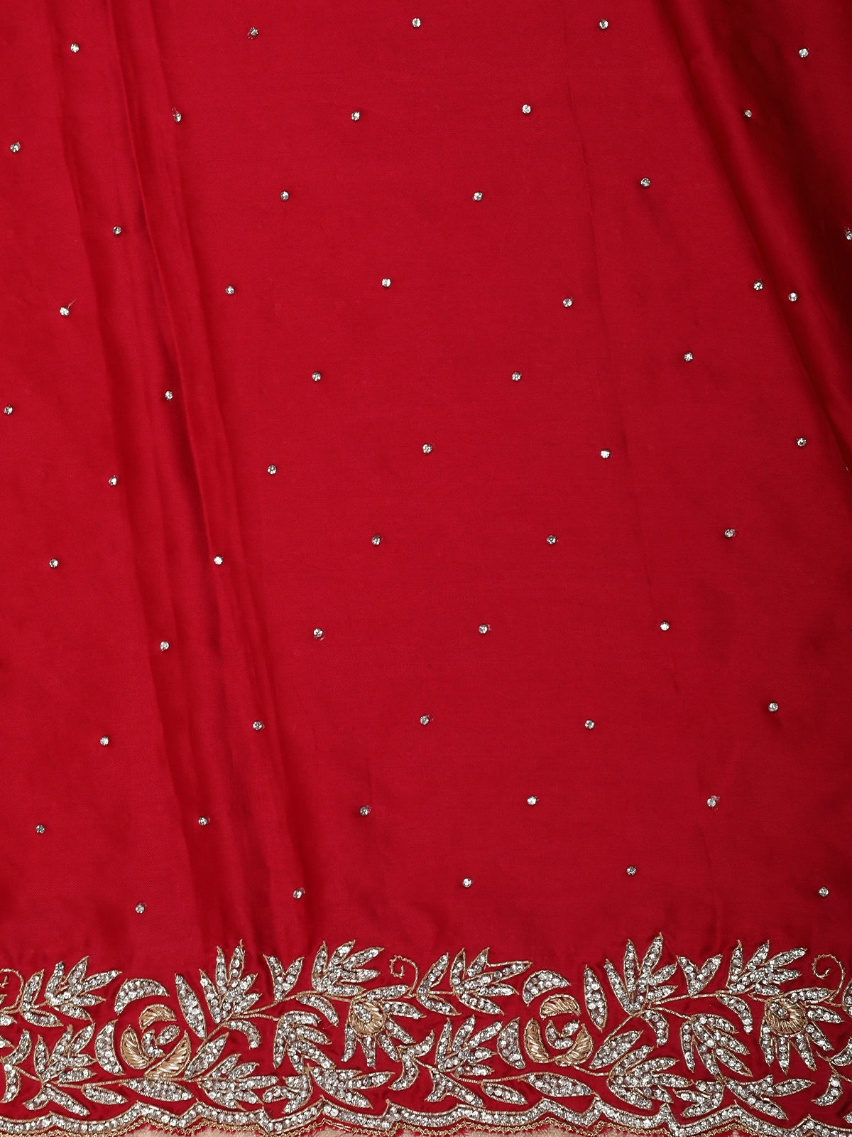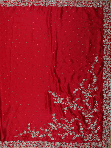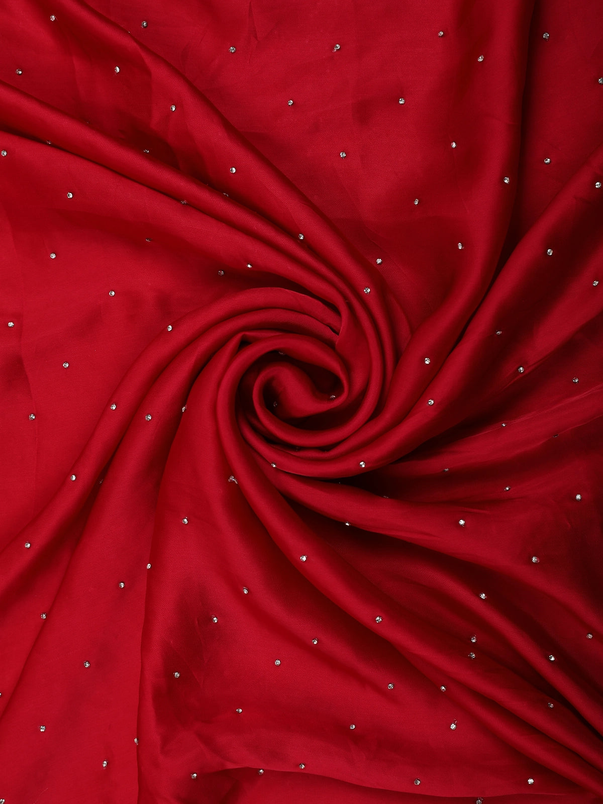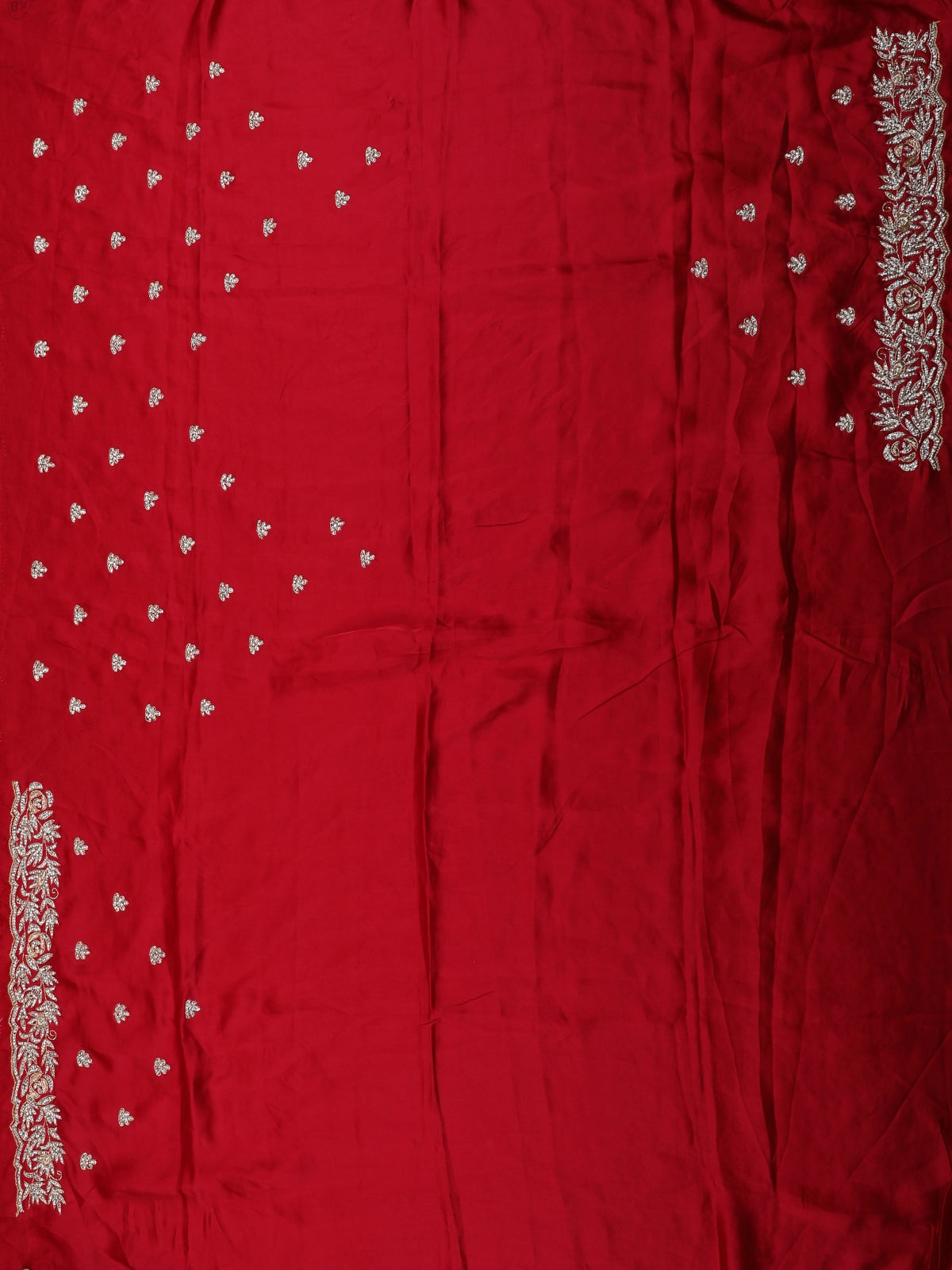 The luxurious satin fabric drapes beautifully, offering a smooth, glossy finish that enhances the richness of the deep red hue. The saree is adorned with delicate sequins and bead embroidery, thoughtfully arranged to add subtle sparkle without overpowering the overall look. A finely embroidered border elevates the design, lending a graceful and festive appeal.