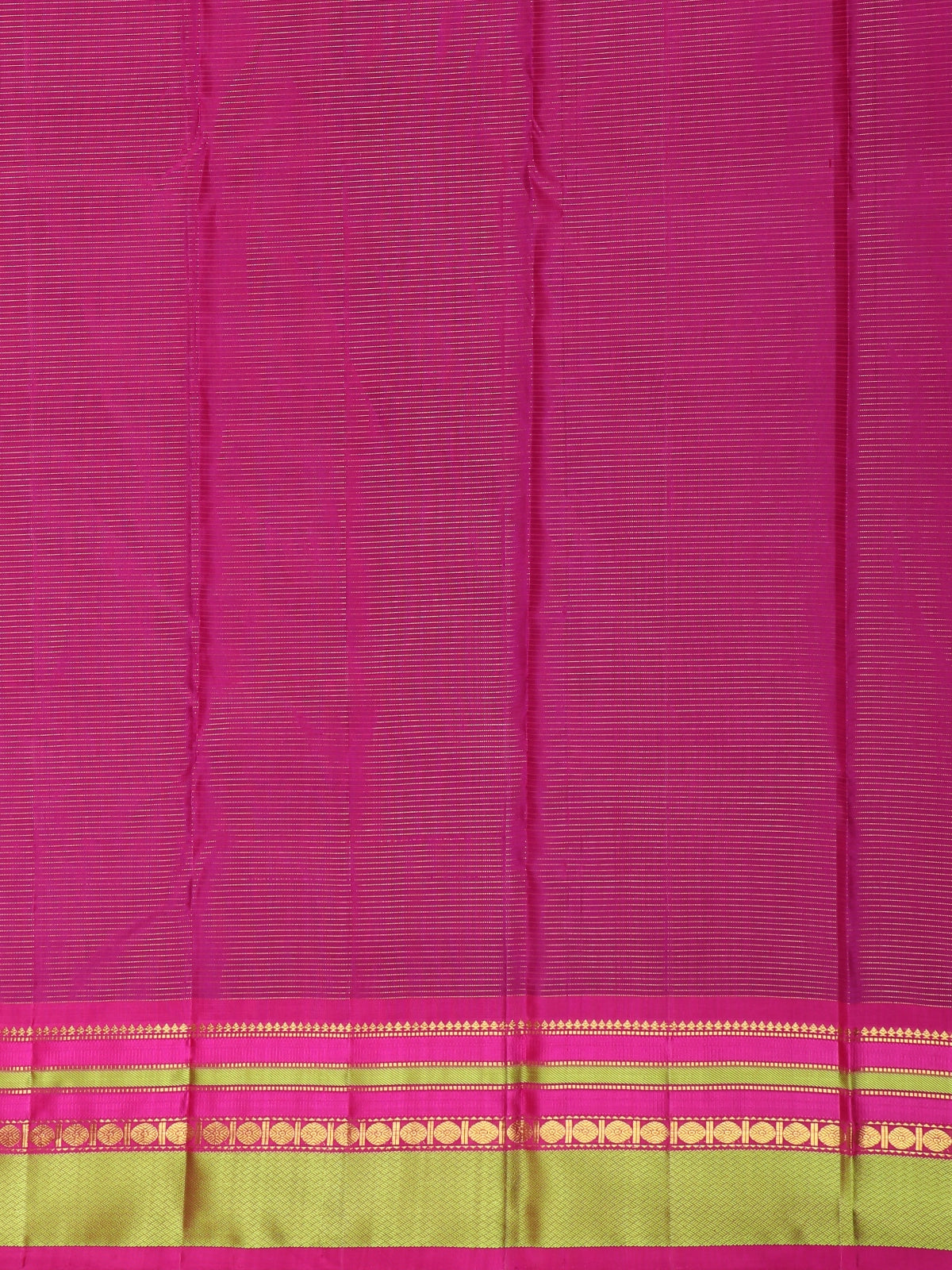 This elegant Pure Kanchipuram Silk Saree is woven in a vibrant queen pink tone with subtle striped woven detailing that adds depth and graceful texture to the silk body. The fine stripes enhance the natural sheen of the silk, giving the saree a refined yet festive appearance.
