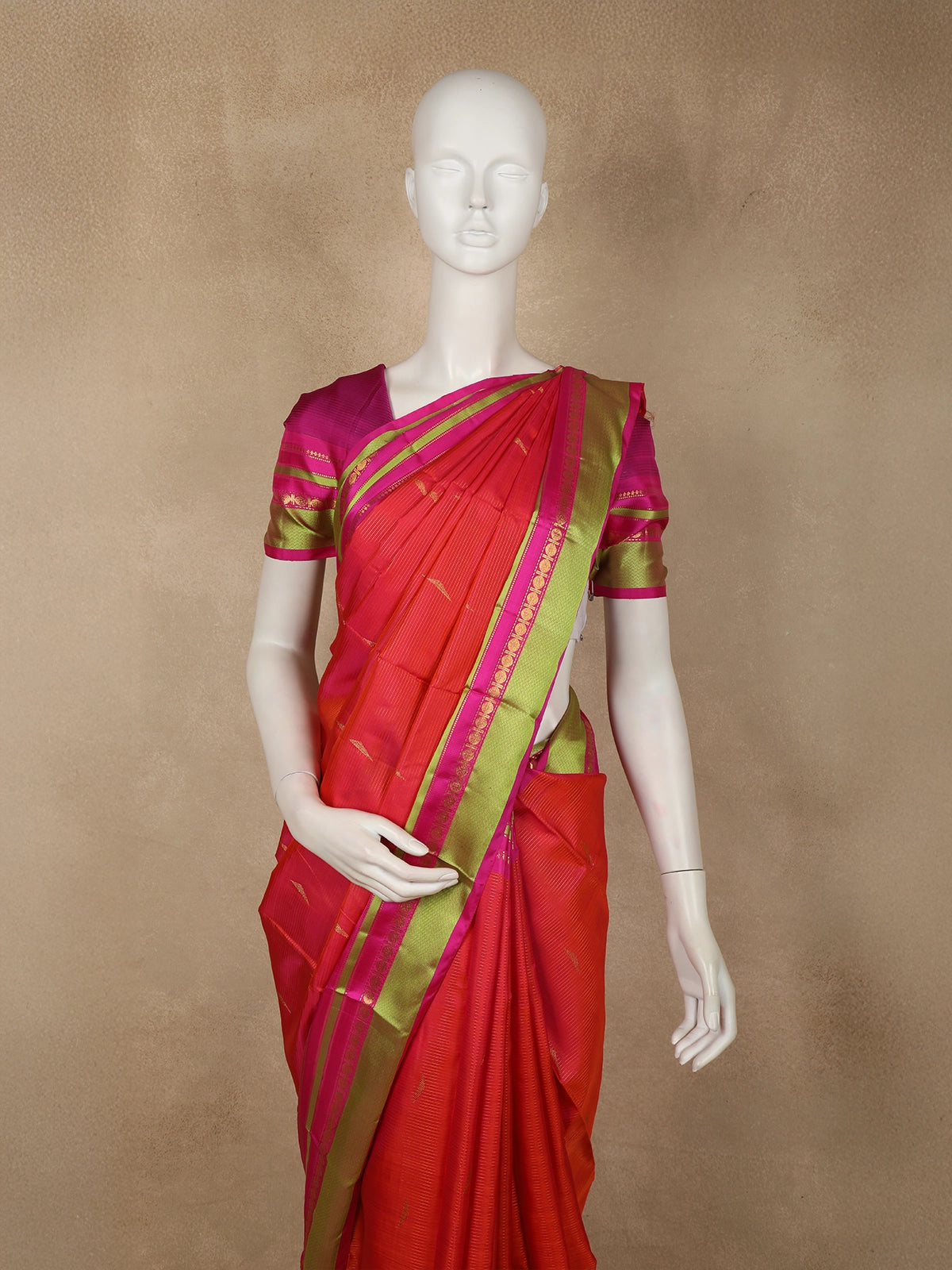 The saree is beautifully contrasted with a striking parrot green border, enriched with intricate antique gold zari weaving that lends a traditional and regal charm. Accents of bright pink along the border create a harmonious colour balance, while the zari highlights elevate the overall richness. The pallu continues the contrast with classic zari elements, completing the look with timeless elegance.