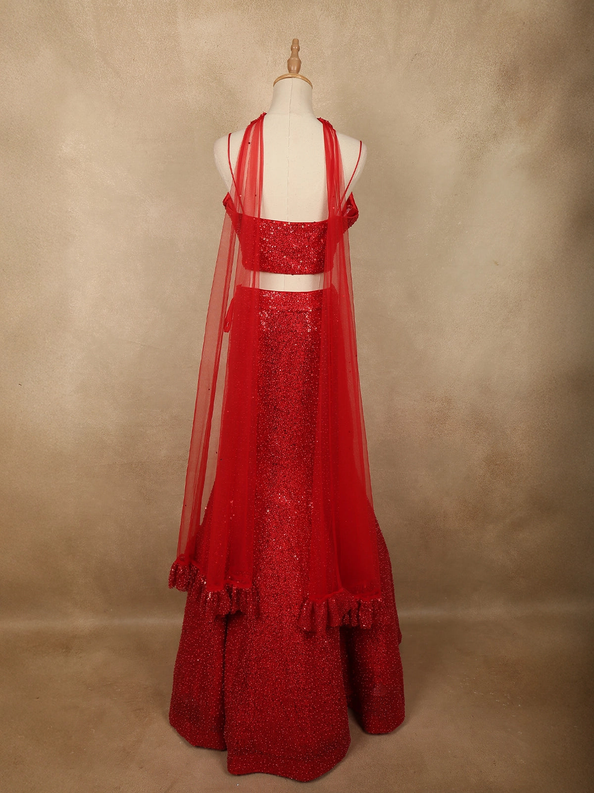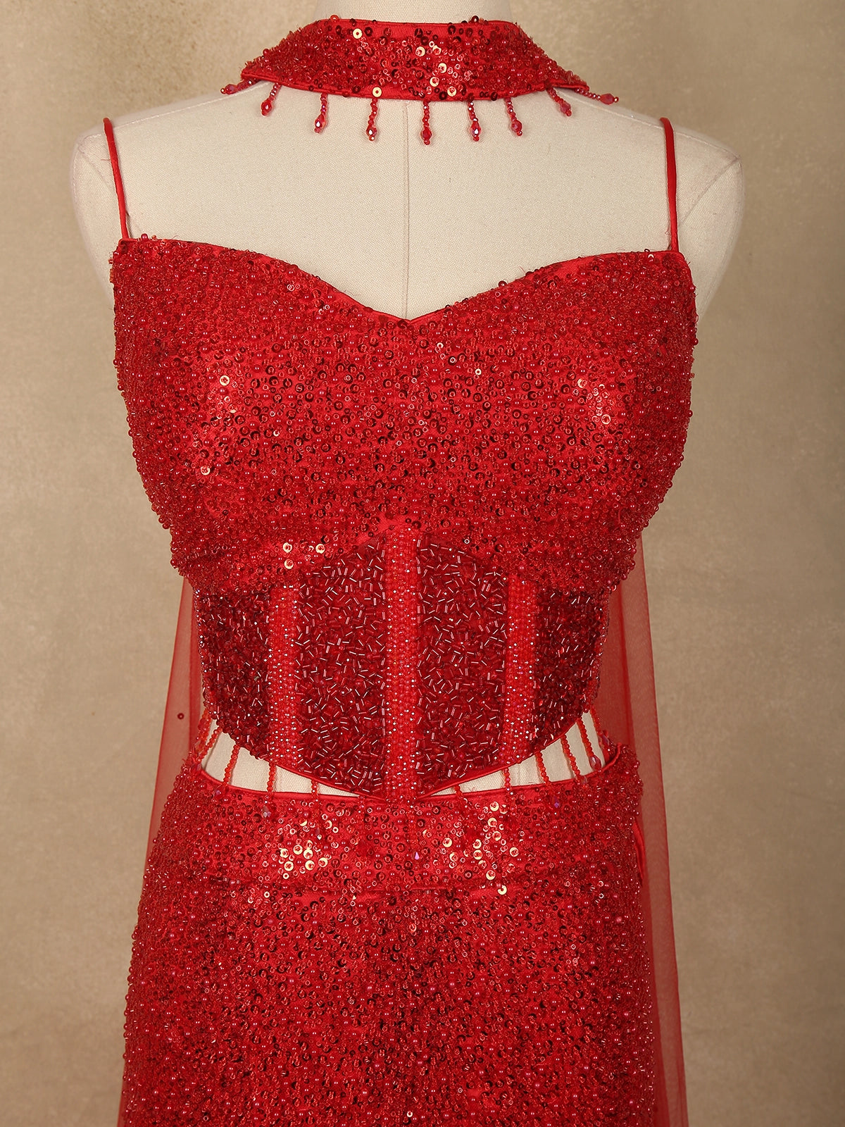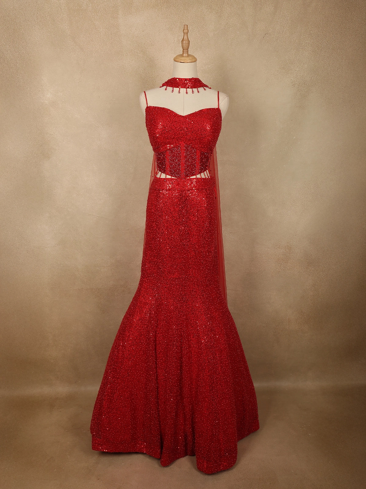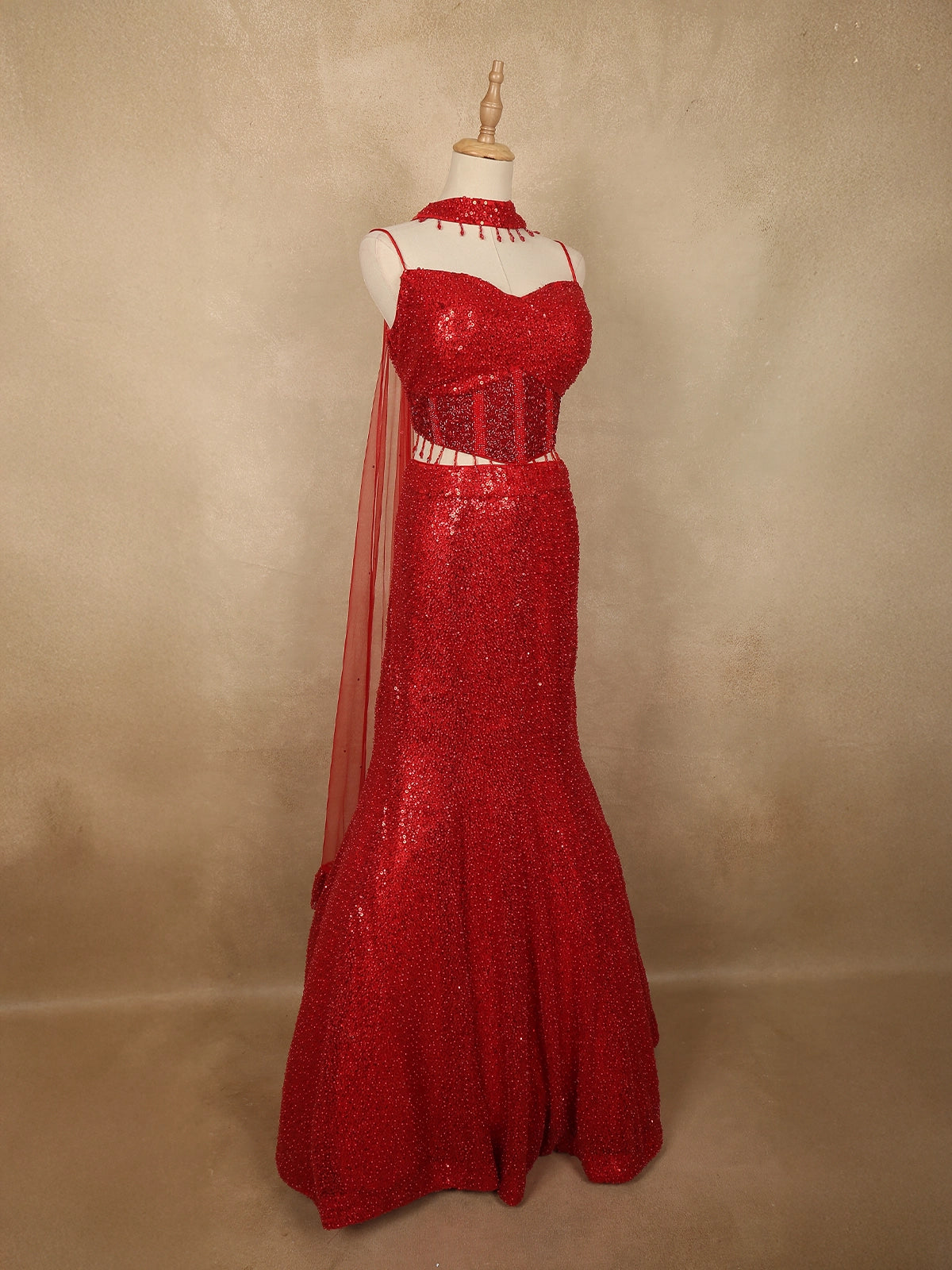 The mermaid-style lehenga skirt flows elegantly from the fitted waist into a dramatic flared hem, richly decorated with shimmering sequins embroidery that creates a luxurious red-carpet appeal. Complementing the outfit is a matching net dupatta styled as a choker neckline accessory, beautifully embellished with beads and sequins, adding a unique designer element to the ensemble.