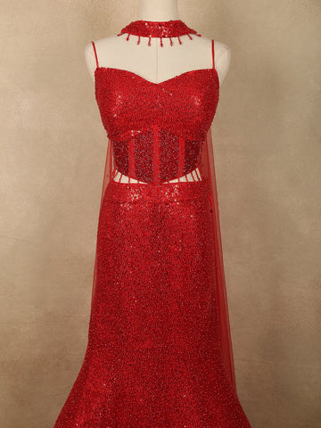 Make a striking statement with this radiant crimson red mermaid lehenga ensemble, designed to capture attention with its dazzling elegance and modern silhouette. Crafted from premium net fabric, the entire outfit is richly adorned with heavy sequins and beads embroidery, creating a luminous sparkle that beautifully reflects light with every movement.