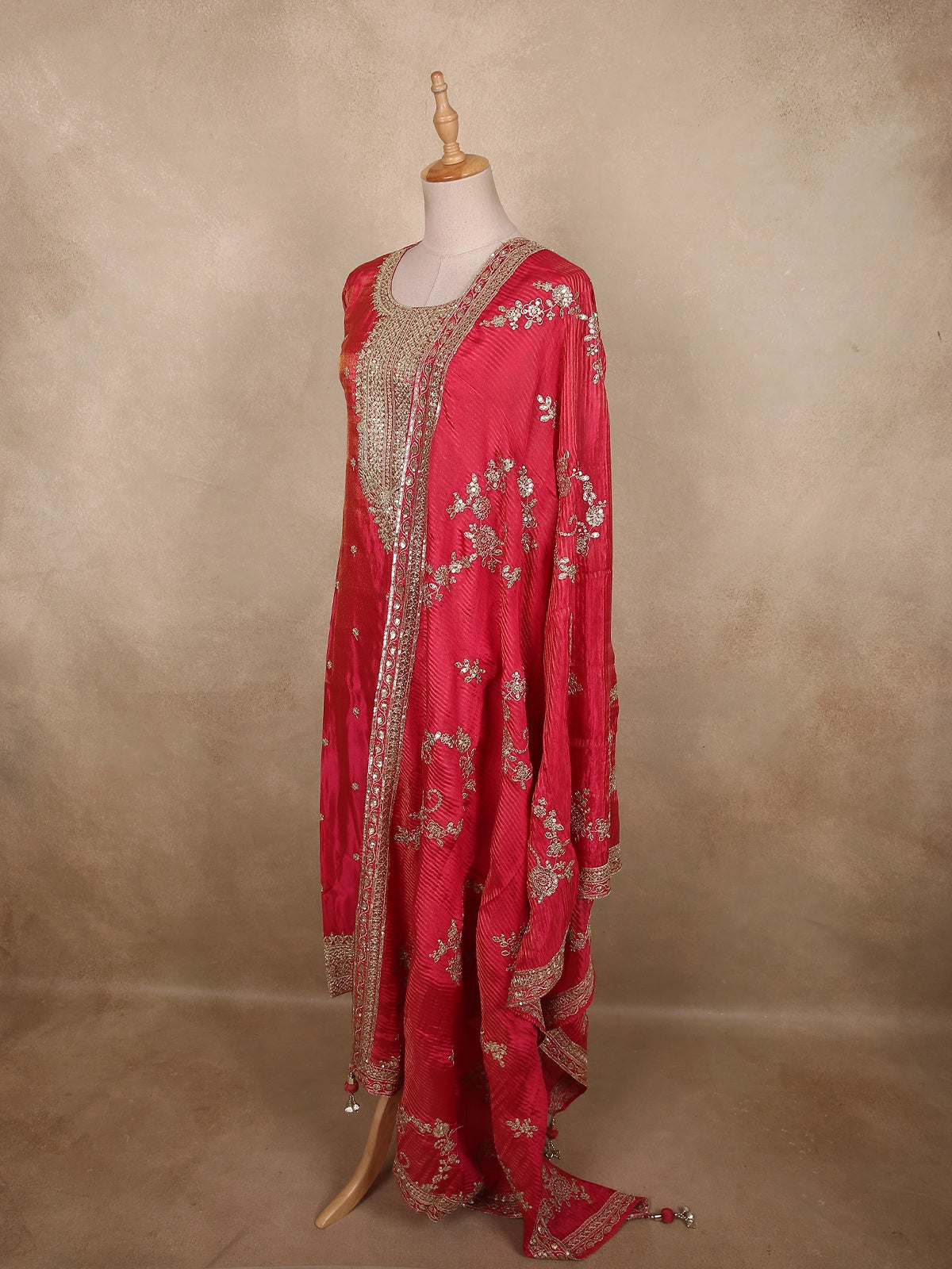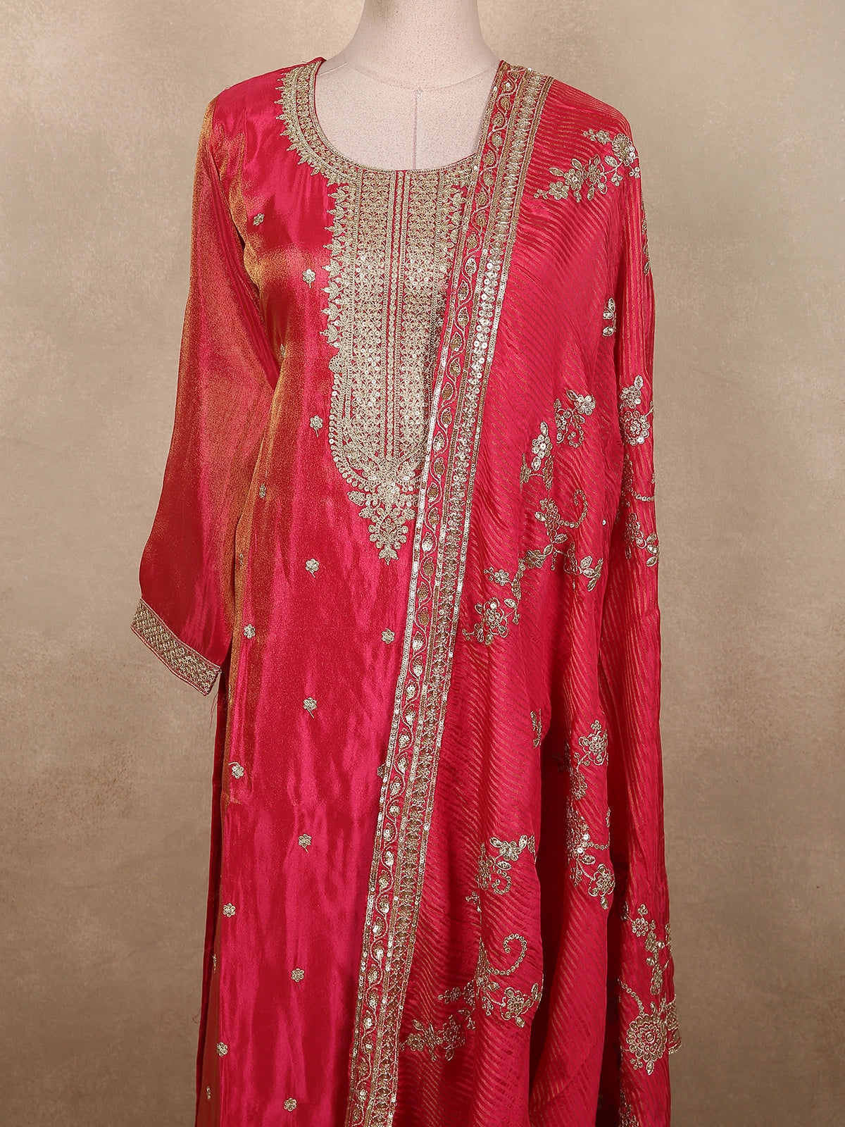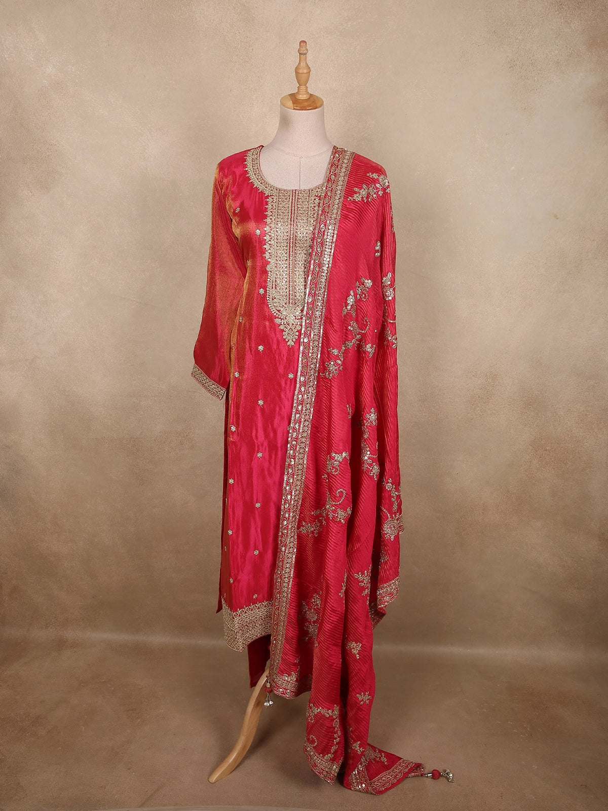 Step into festive elegance with this Radiant Rani Pink Straight Cut Salwar Suit, a perfect blend of traditional craftsmanship and contemporary grace. The vibrant rani pink base radiates richness and femininity, beautifully enhanced by the soft sheen of lightweight organza fabric.