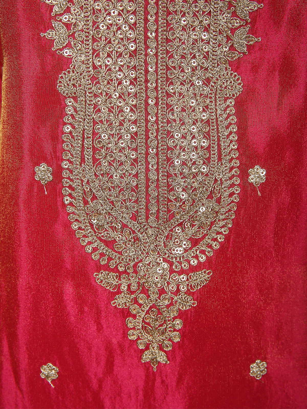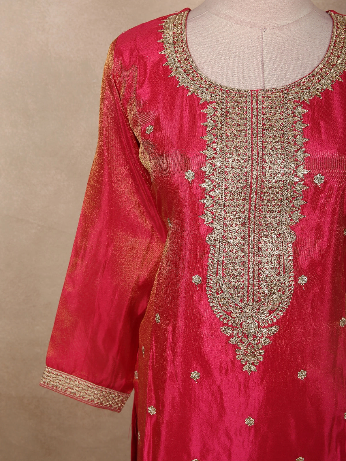 The kurta features intricate floral zari embroidery in antique gold tones, delicately placed along the neckline, front panel, hemline, and sleeves. The embroidery showcases fine detailing with floral vines and traditional motifs, adding a regal charm to the ensemble. The straight cut silhouette offers a flattering, structured look while ensuring comfort and ease of movement.