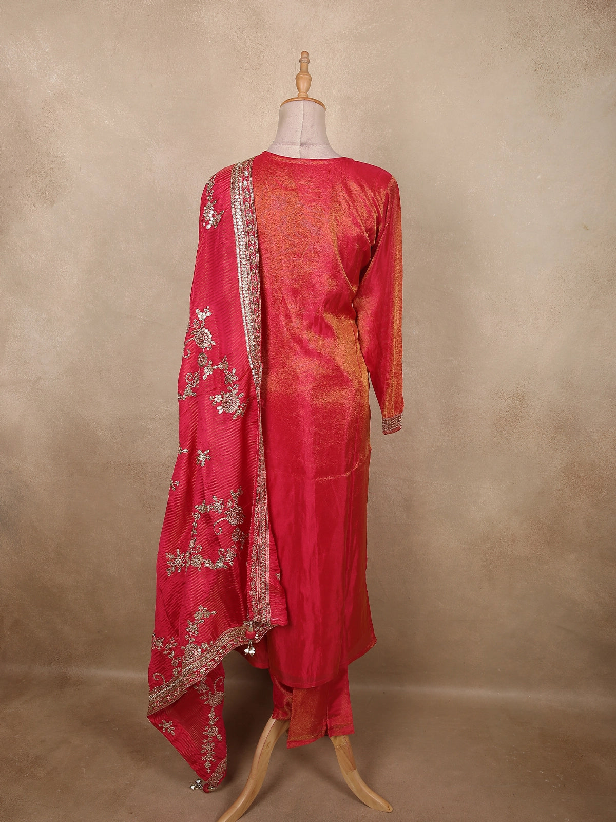 Paired with a matching bottom, the highlight of this set is the coordinated organza dupatta, adorned with zari embroidered motifs and an elegantly finished border that elevates the overall appeal. The subtle texture of the dupatta complements the richness of the kurta, creating a perfectly balanced festive look.