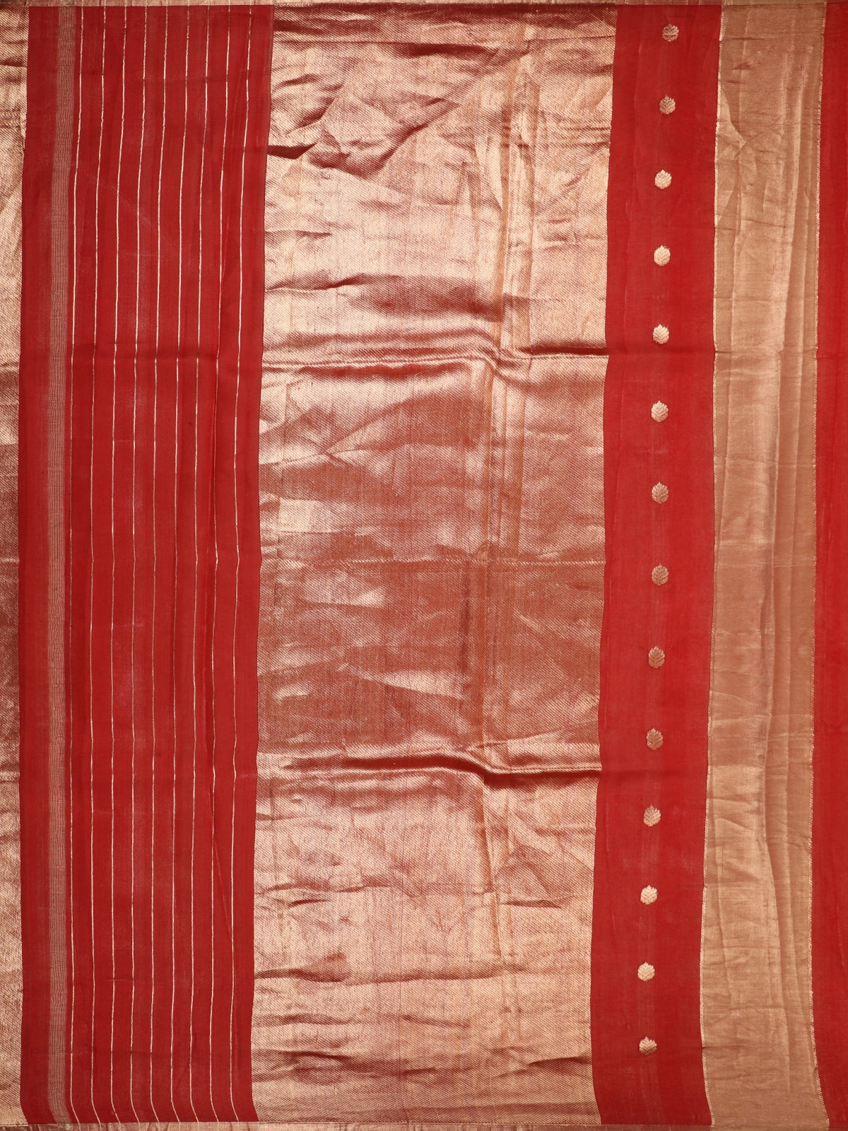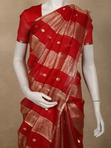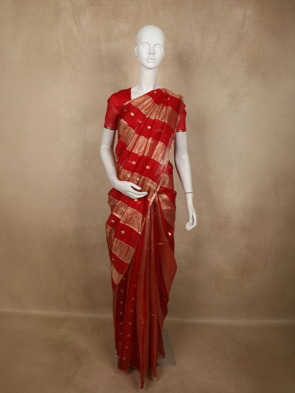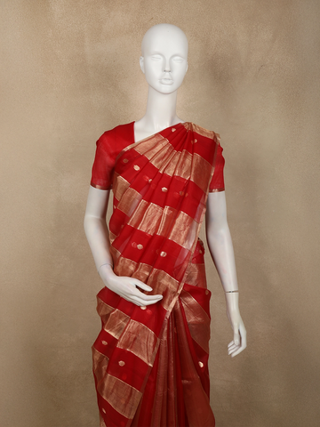 The vibrant vermilion red base is beautifully enhanced with delicate gold zari butta motifs scattered across the body, lending a subtle touch of heritage craftsmanship. The highlight of the saree lies in its striking bold striped zari woven design running across the pallu and drape, creating a rich visual contrast and enhancing the saree’s regal appeal.