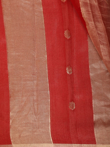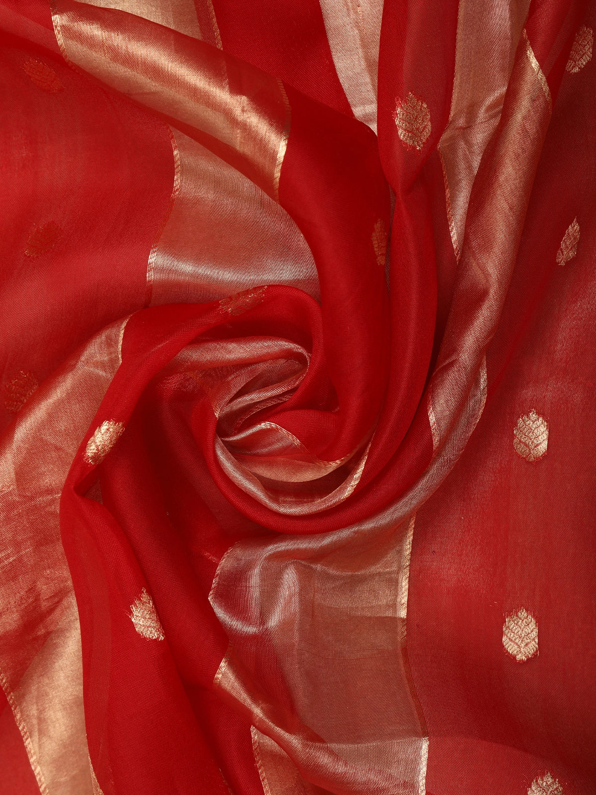 Radiant Vermilion Red Striped Zari Woven Design Pure Organza Saree with Zari Border