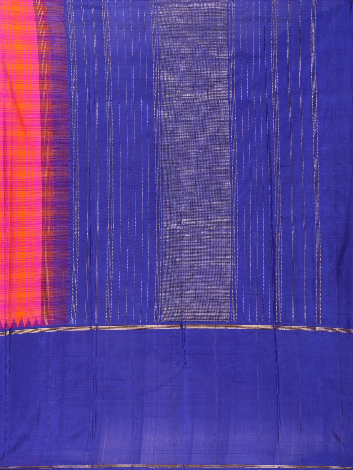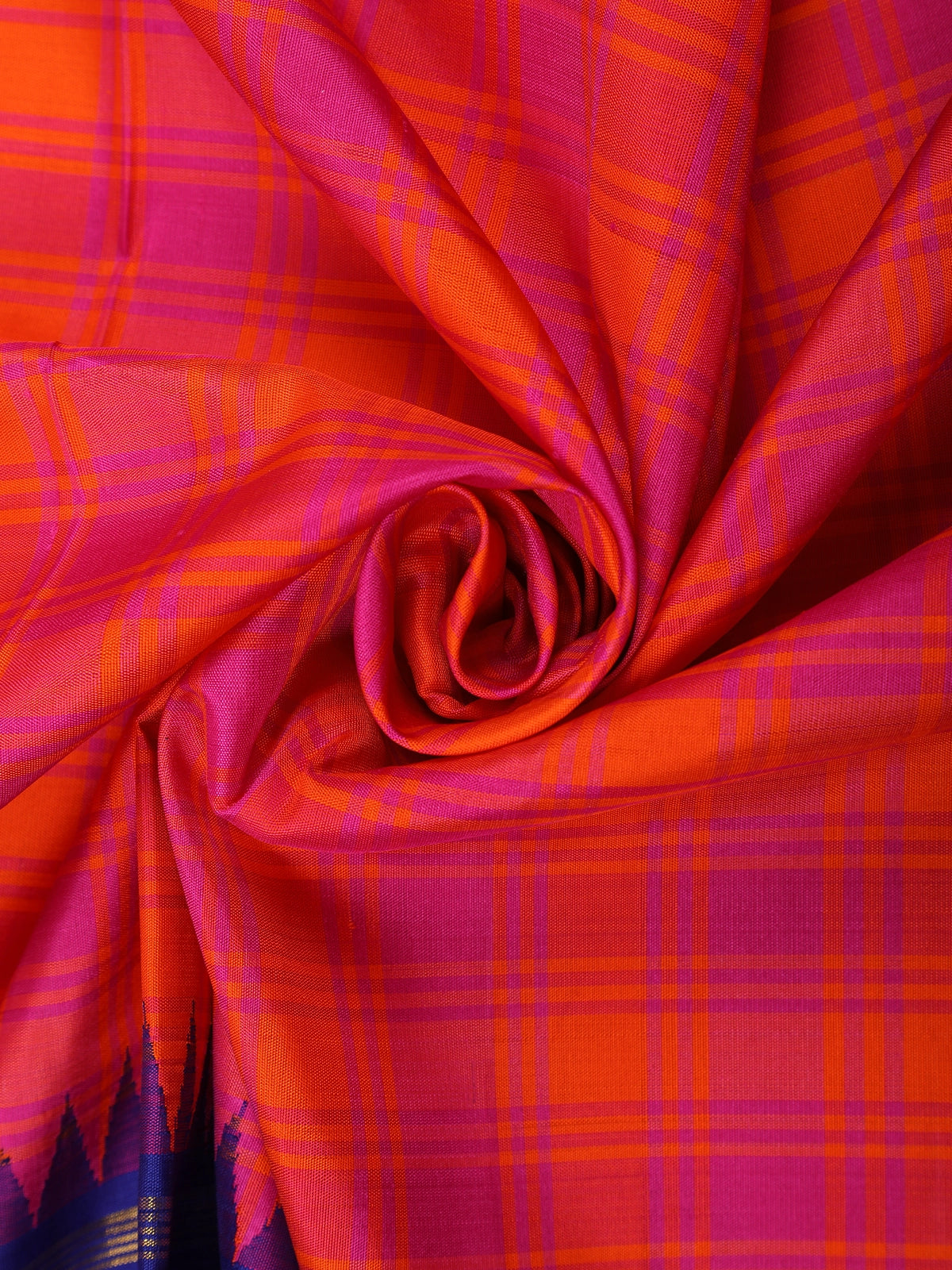 Rani Pink and Orange Checked Woven Kanchipuram Silk Saree with Royal Blue Zari Border