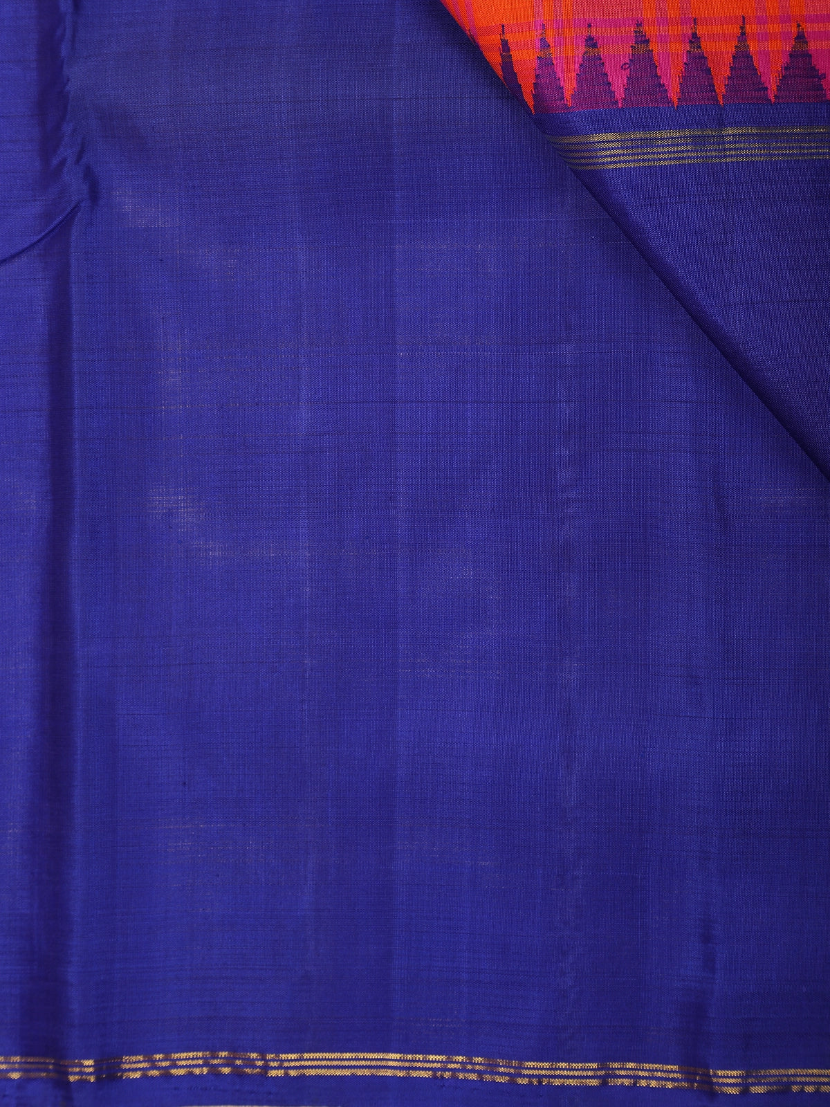 Drape yourself in traditional elegance with this stunning Kanchipuram Silk Saree, beautifully woven in a vibrant mix of rani pink and orange checks. The rich royal blue border and pallu highlighted with zari detailing add a striking contrast, making it a perfect choice for festive celebrations and cultural occasions.