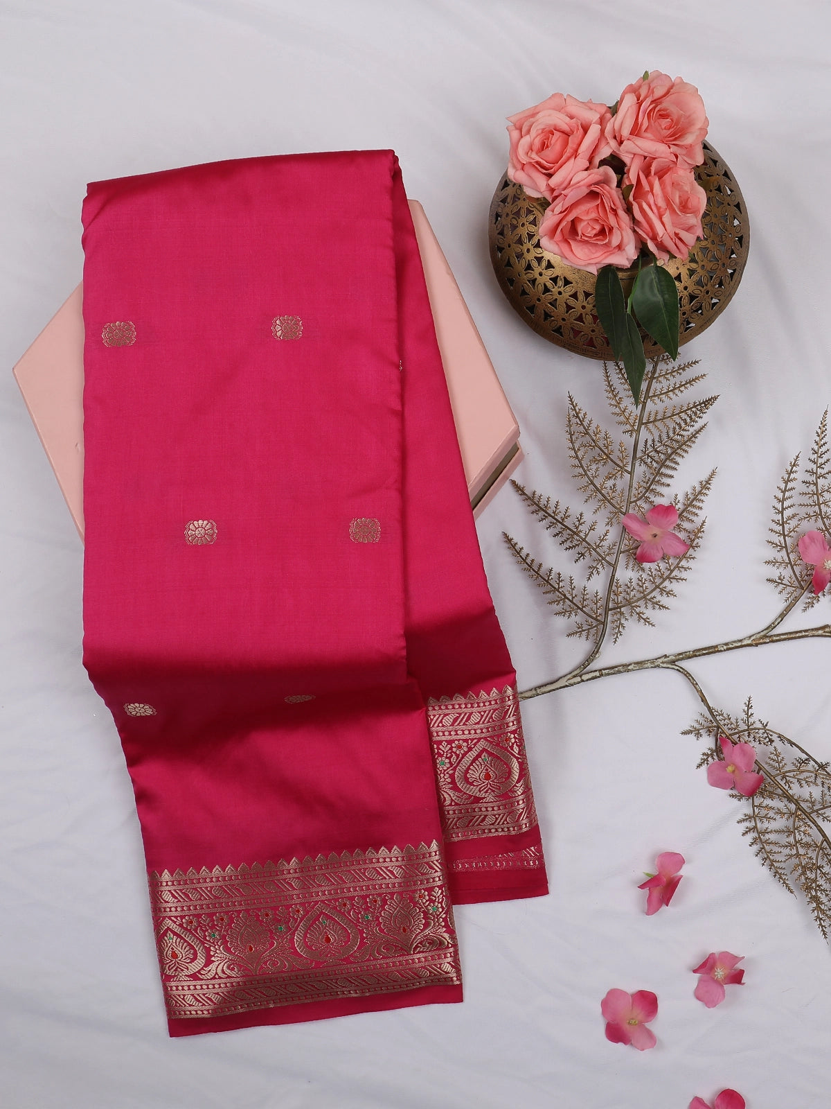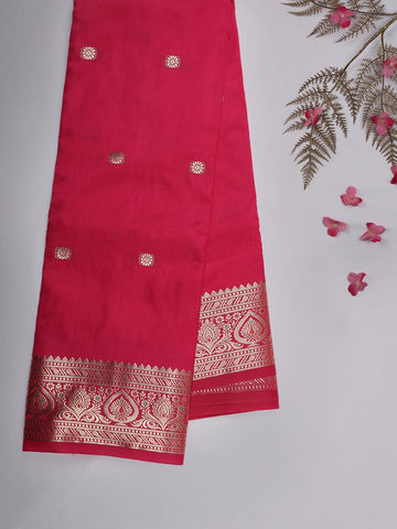 Rani Pink Butta Woven Design Soft Silk Saree with Silver Zari Floral Border