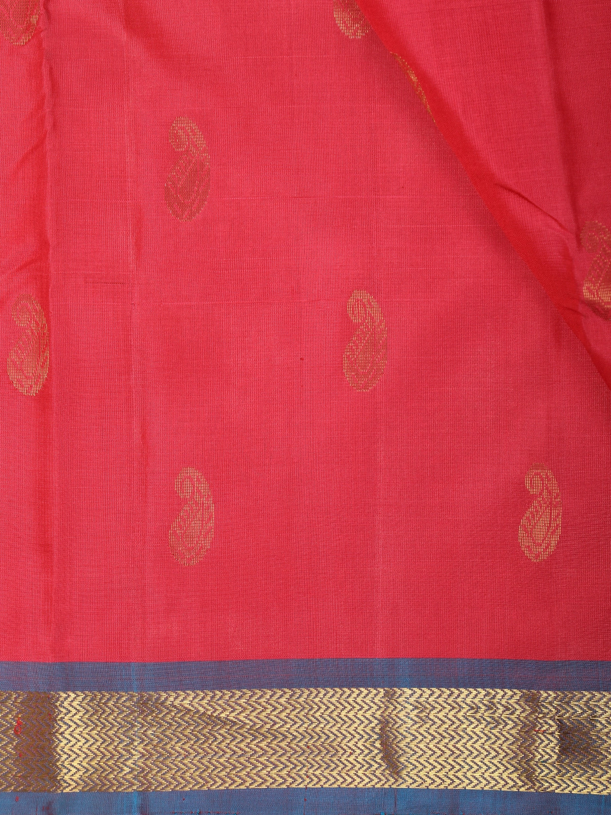 Complementing the vibrant pink base is a contrasting zari border, beautifully highlighted with antique gold zari weaving and a subtle blue contrast edge that adds depth and definition to the drape. The luxurious silk fabric offers a smooth texture with a natural sheen, ensuring an elegant fall and regal presence.