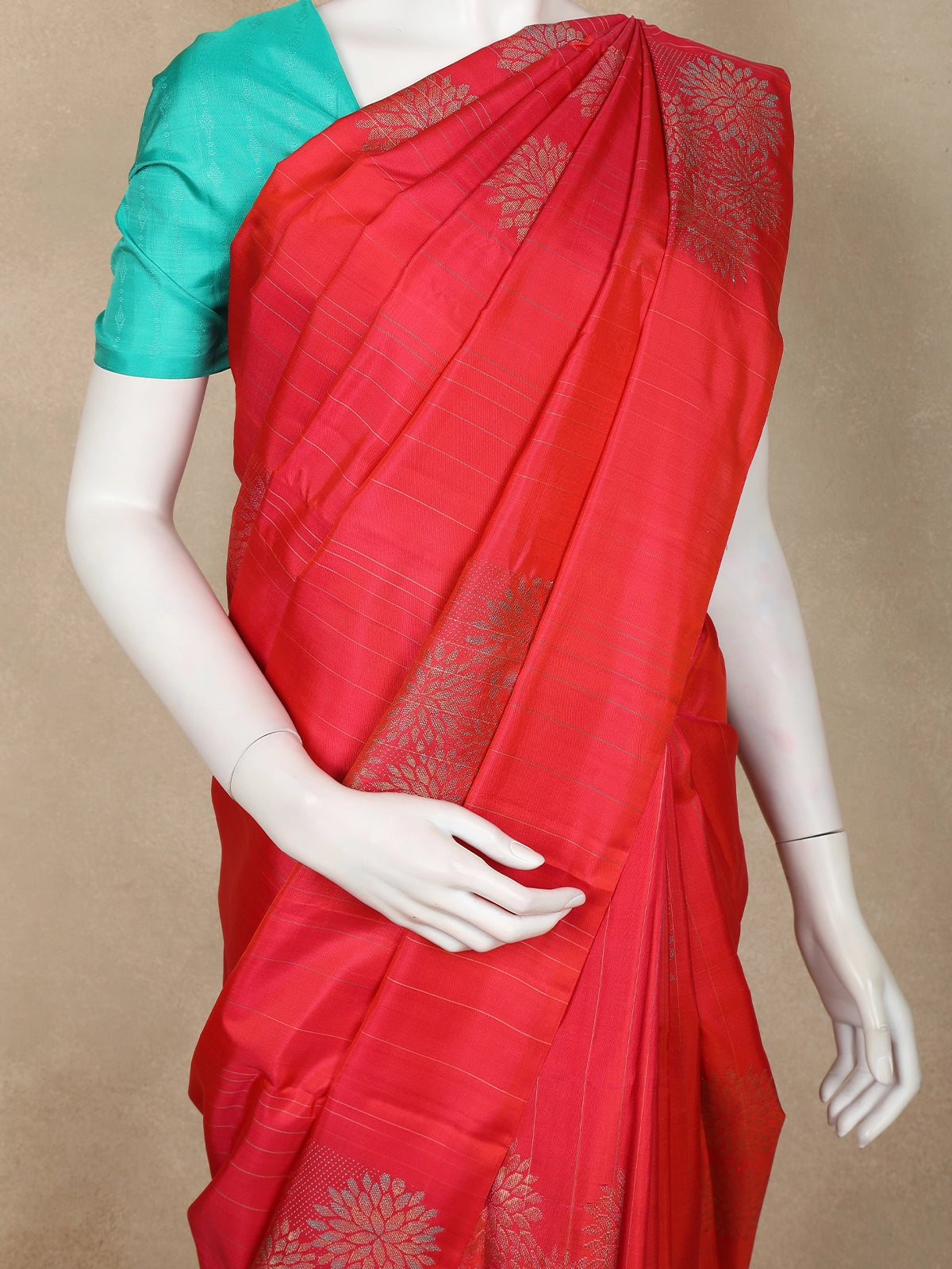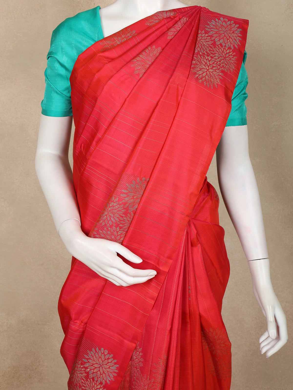 Embrace timeless tradition wrapped in elegance with this Bottle Green Floral Design Kanchipuram Silk Saree. Crafted with rich silk that radiates a luxurious sheen, this saree features intricate floral woven motifs that enhance its regal charm.