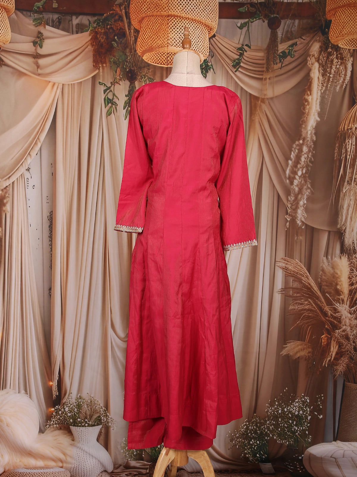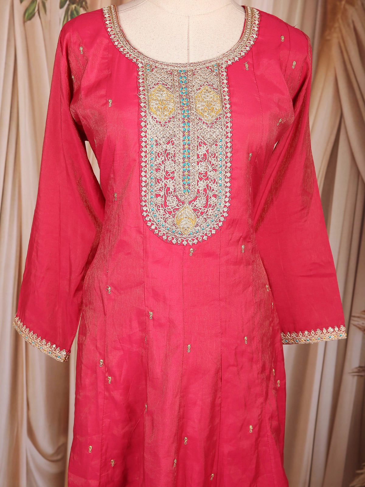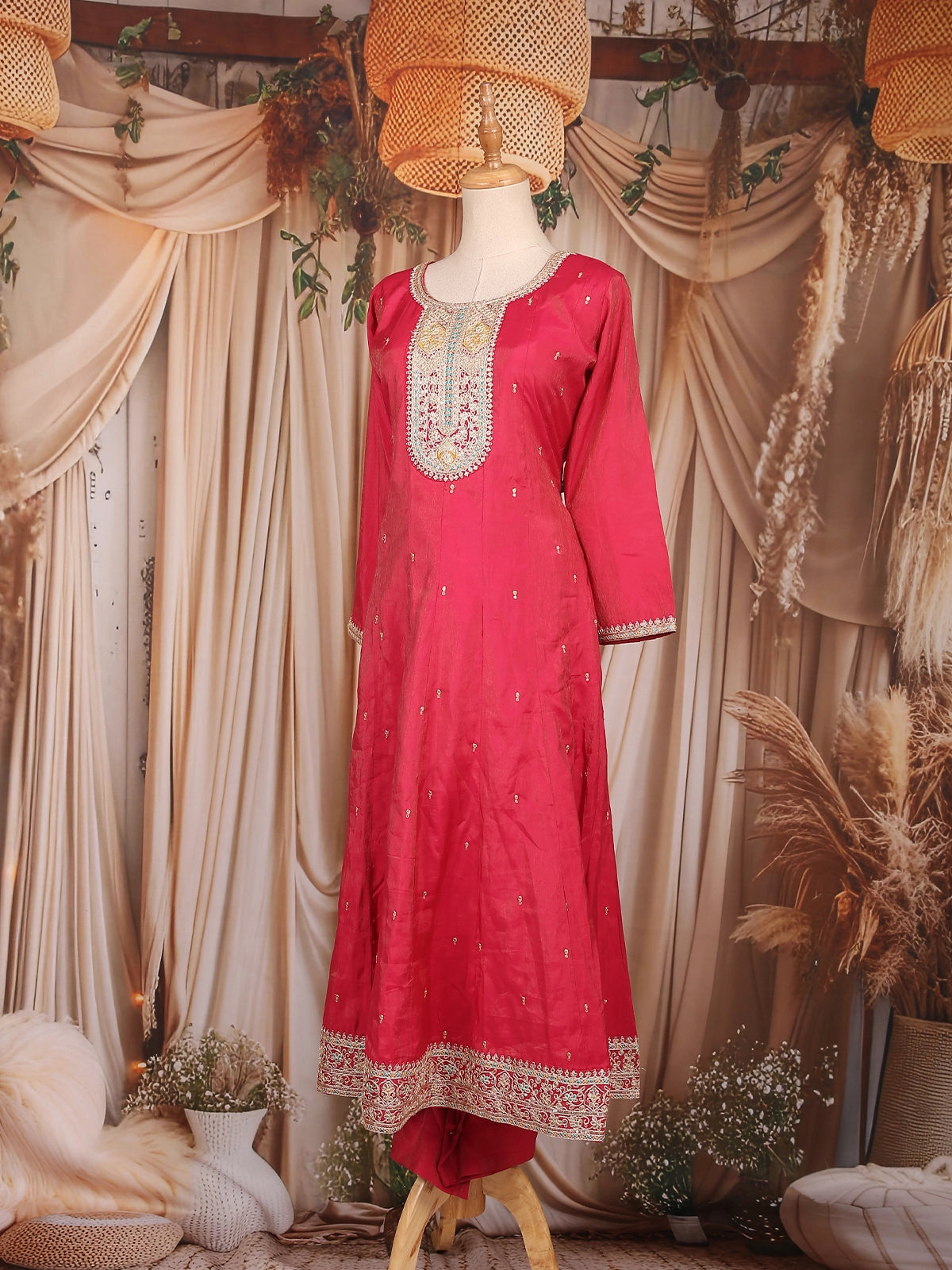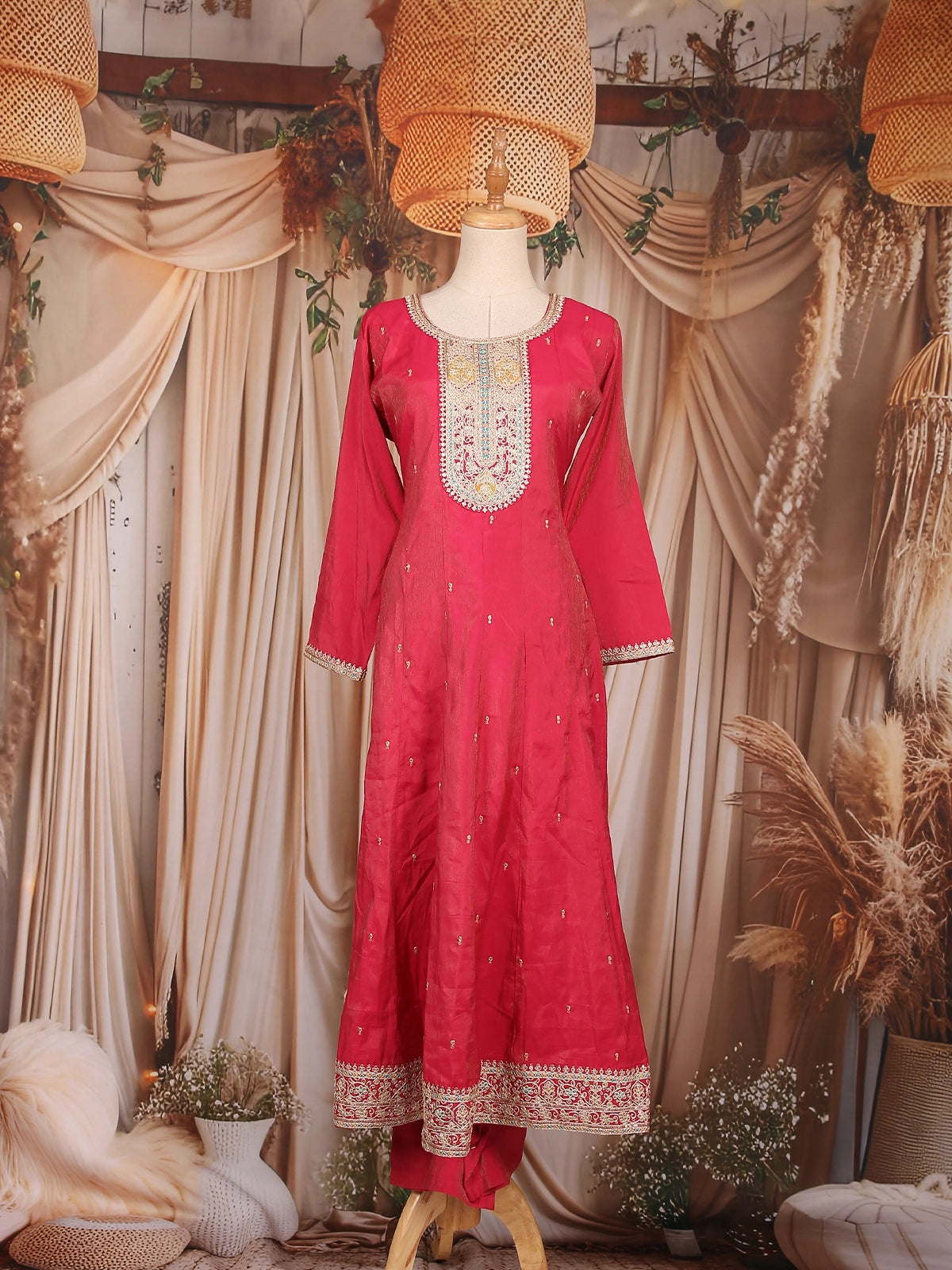 The kurta features exquisite floral embroidery that adds a delicate sparkle against the vibrant rani pink backdrop. Paired with a matching bottom and dupatta, this ensemble offers a complete traditional look with a modern charm. Perfect for festivals, family gatherings, temple visits, and cultural celebrations — this outfit delivers beauty and comfort in one stunning package.