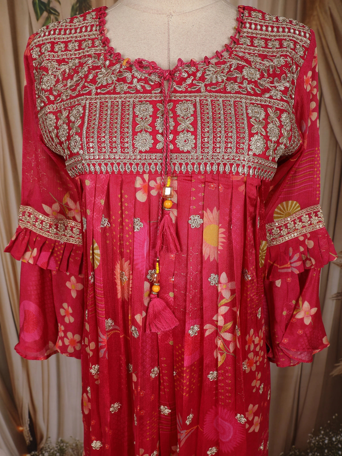 The kurta features a beautifully embroidered yoke panel adorned with intricate thread work and mirror-style accents, adding a rich handcrafted feel. The gentle gathers below the yoke create a graceful flare that moves softly with every step. The bell sleeves with embroidered cuff details enhance the outfit with a stylish and youthful appeal.