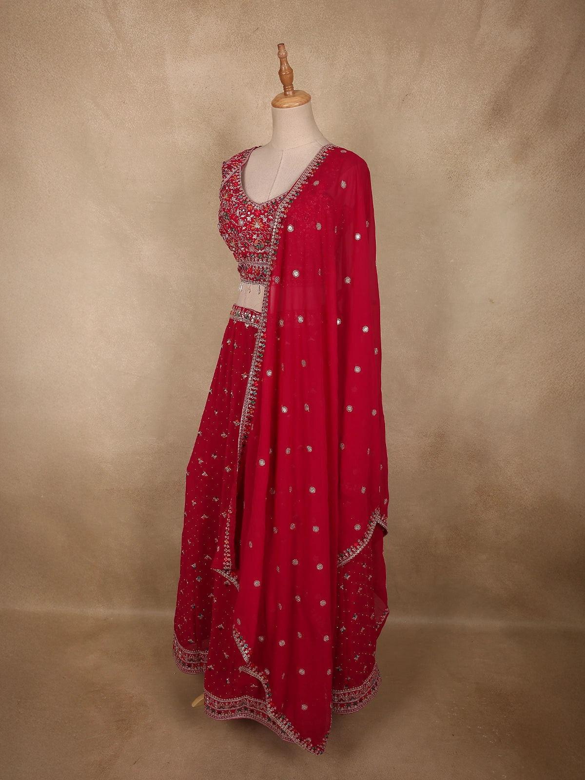 Crafted in a captivating rani pink tone, this georgette lehenga set is a perfect balance of mystery, elegance, and festive charm. The dark, jewel-toned base subtly shifts between deep green and black under light, creating a luxurious depth that elevates the entire ensemble.