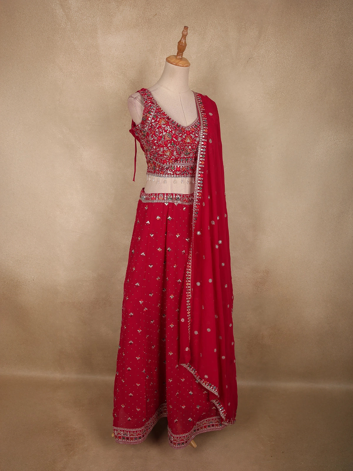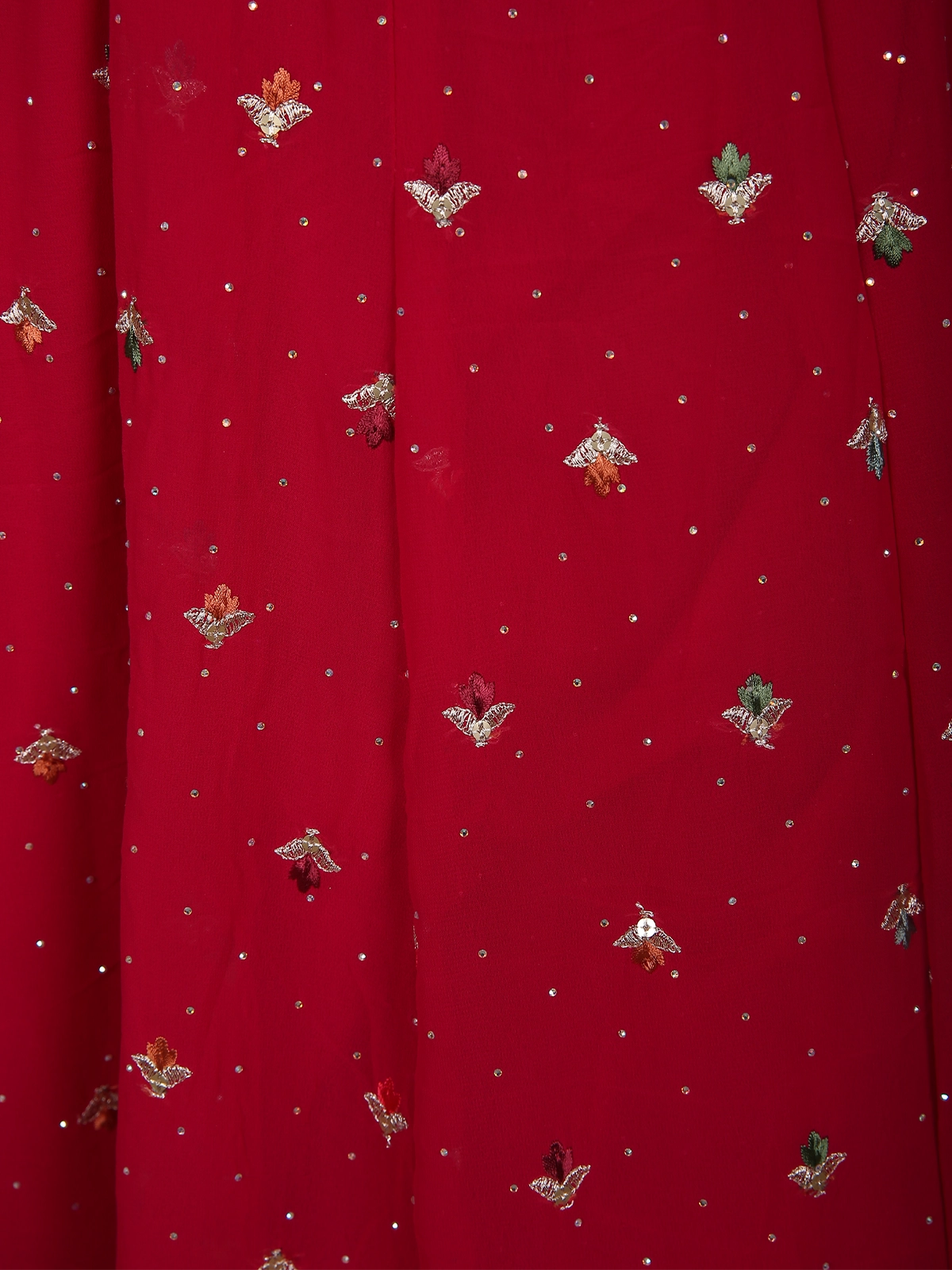 Flowing gracefully, the lehenga skirt features scattered floral embroidered motifs across the georgette base, giving it a soft sparkle and an airy, fluid drape. The finely embroidered border enhances movement and adds a regal touch, ensuring every step looks effortlessly elegant.